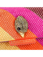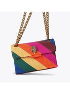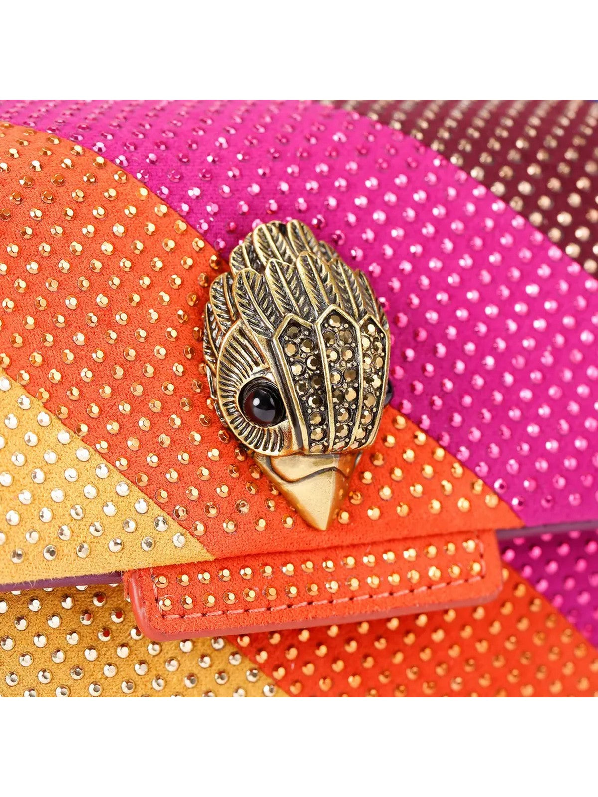 Borsa KURT GEIGER realizzata in tessuto scamosciato con motivo a strisce diagonali arcobaleno, sormontato da cristalli multicolore. La testa d'aquila in ottone anticato è impreziosita da cristalli opachi in ottone e occhi in cristallo nero sulla patta frontale.