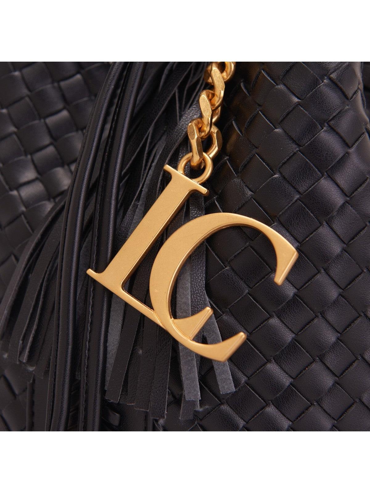 Borsa LA CARRIE modello secchiello realizzata in pu con lavorazione intrecciata. Un manico e tracolle a catena rimovibili. Chiusura con coulisse e bottone automatico. Interno foderato con tasca zippata.