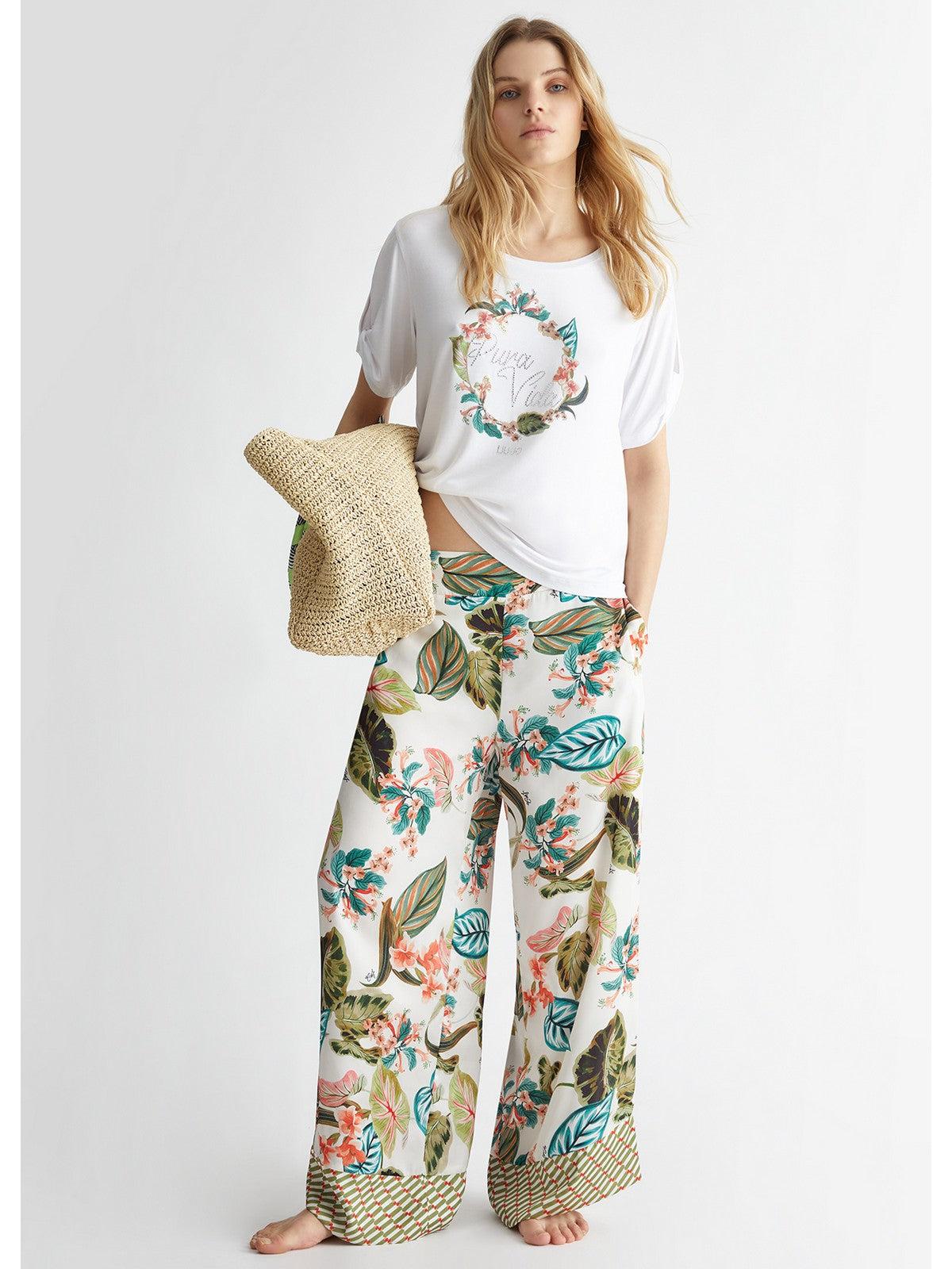 T-shirt LIU JO BEACHWEAR realizzata in jersey di viscosa stretch. Stampa jungle e lettering con strass sul davanti. Scollo rotondo e maniche corte con nodo e apertura a goccia.