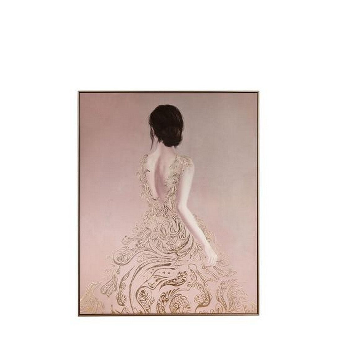 Quadro con cornice realizzato con la tecnica della serigrafia su tela con applicazioni. Figura femminile di spalle con un vestito creato con preziosi decori floreali regna come unico soggetto. Renderà indimenticabile ogni living.