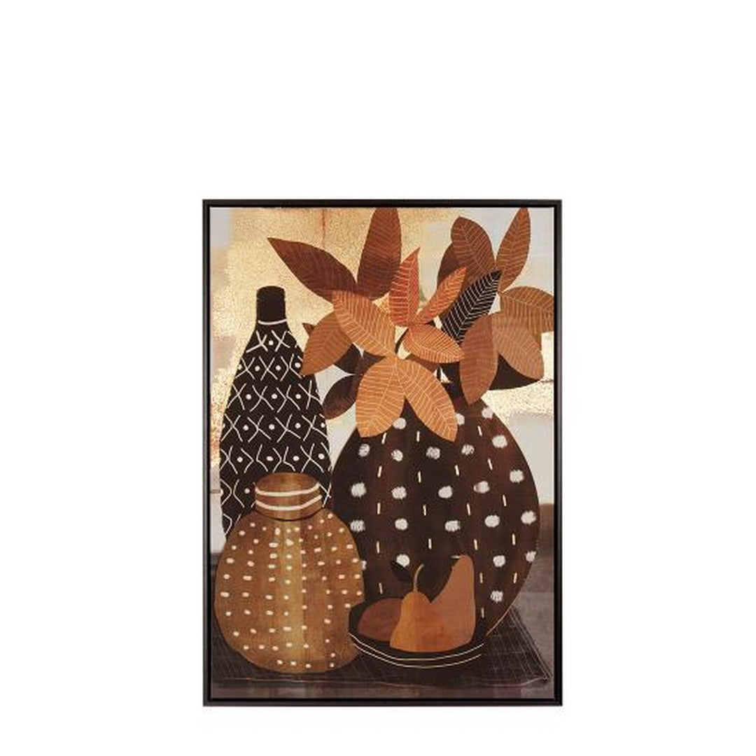 Quadro con cornice realizzato con la tecnica della serigrafia su tela con applicazione di foglia d'oro. Natura morta dalle calde nuance del marrone e decori etnici. Il dettaglio ricercato che completa il vostro arredamento dall'atmosfera Ethno Chic.