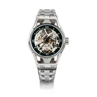 Il quadrante trasparente permette di ammirare il movimento in funzione, impreziosito da un rehaut nero con numeri romani che dona carattere e profondità. La cassa da 42 mm in acciaio è abbinata a un bracciale in acciaio robusto e confortevole, mentre il fondello a vite in titanio garantisce massima protezione al calibro interno. Il tutto è completato da un vetro zaffiro ad alta resistenza e da un'impermeabilità fino a 10 bar, ideale per l'uso quotidiano.