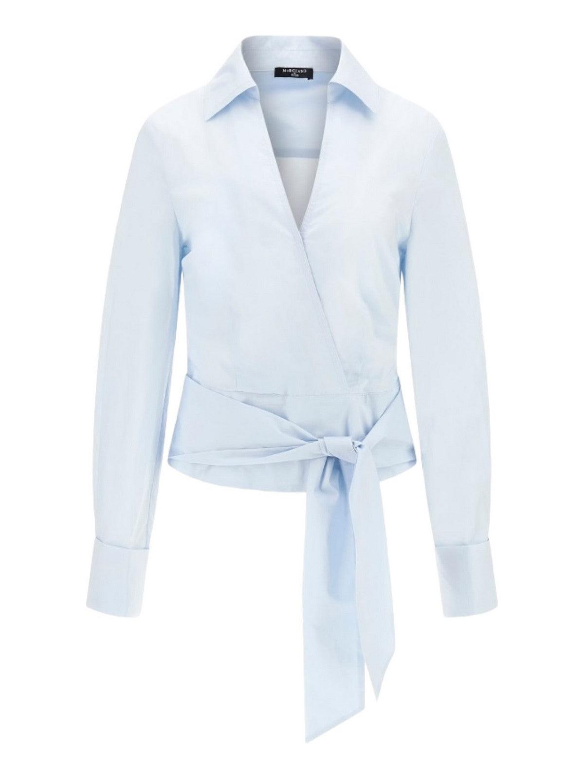 Camicia MARCIANO in cotone. Colletto classico con scollo a V. Maniche lunghe con gioielli sui polsi. Fusciacca in vita da annodare.