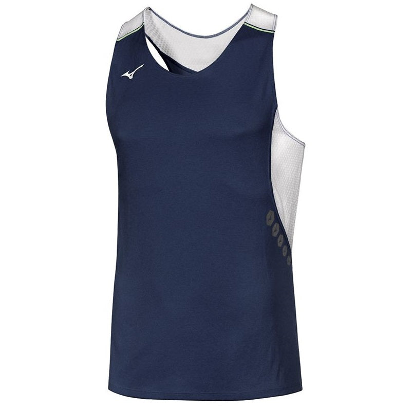 Canotta running Mizuno da uomo. Canotta Mizuno per il running in tessuto leggero e traspirante con tecnologia mizuno DRYLITE ®, mesh Jaquard laterale per garantire una migliore performance, stampa Hex Runbird e dettagli fluo in contrasto. Salbini articoli tecnici per lo sport.