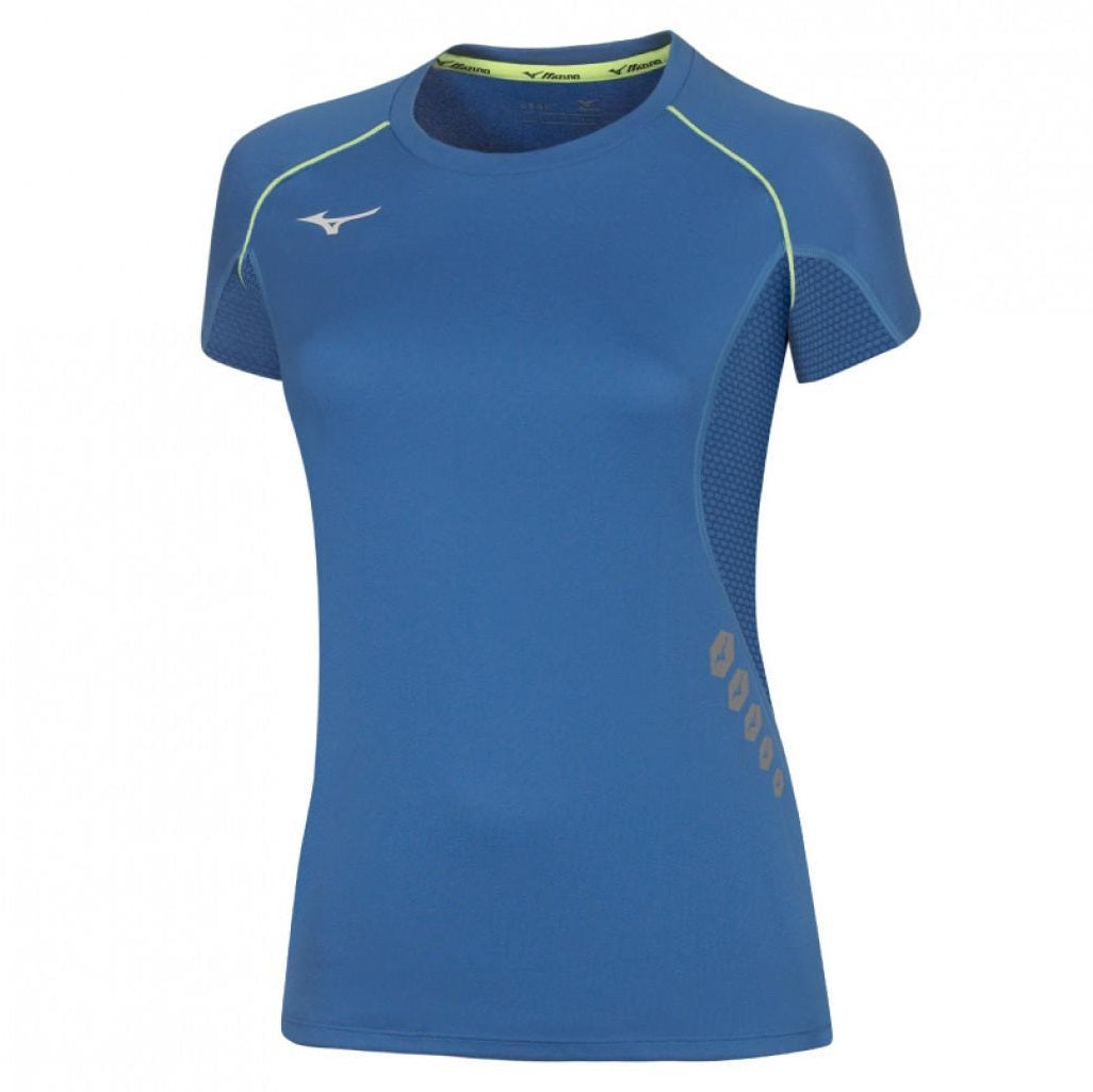 T-shirt running Mizuno da donna. Maglietta Mizuno a manica corta da running in tessuto leggero e traspirante con tecnologia mizuno DRYLITE ®, mesh Jaquard laterale per garantire una migliore performance, stampa Hex Runbird e dettagli fluo in contrasto. Salbini articoli tecnici per lo sport.