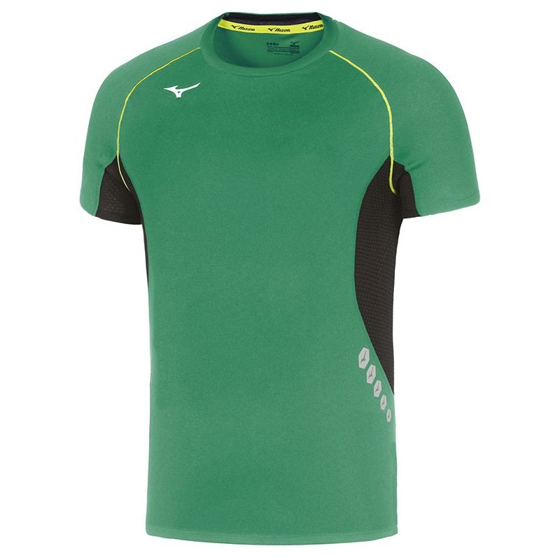 T-shirt running Mizuno da uomo. Maglietta Mizuno a manica corta da running in tessuto leggero e traspirante con tecnologia mizuno DRYLITE ®, mesh Jaquard laterale per garantire una migliore performance, stampa Hex Runbird e dettagli fluo in contrasto. Salbini articoli tecnici per lo sport.