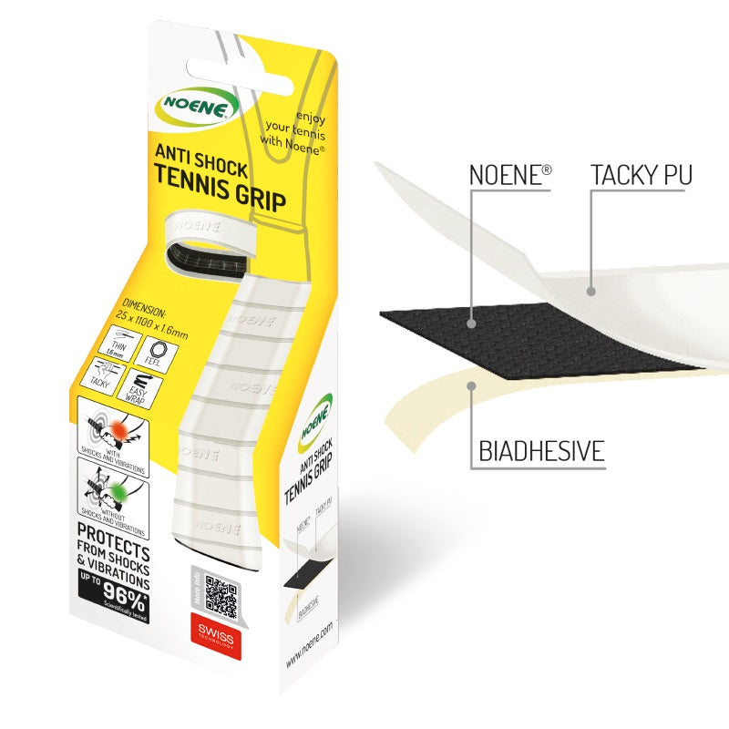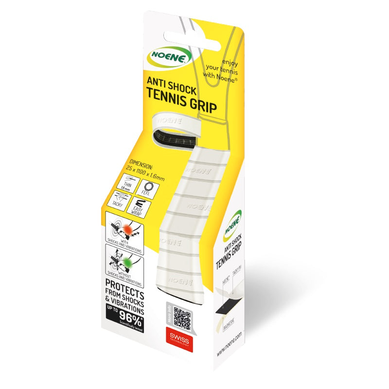 Grip Tennis Noene antishock e antivibrazioni. Grip Noene studiato specificatamente per i tennisti si presenta sottile, leggero e protegge con uno spessore di 1,6 mm senza modificare la sensazione dell'impugnatura. Grazie al materiale noene questo grip tennis assorbe e disperde shock e vibrazioni generati dall'impatto della racchetta con la pallina prevenendo infiammazione e stanchezza di mani, polsi, gomiti e spalle. Questo permette di migliorare la performance, il controllo e la presa. Il rivestimento in PU TACKY garantisce elevata aderenza e precisione anche in condizioni di umidità. Semplice da montare grazie al biadesivo attacca/stacca. Confezione singola in blister Dimensione: 25 x 1100 x 1.6mm Salbini articoli tecnici per lo sport è rivenditore ufficiale Noene .