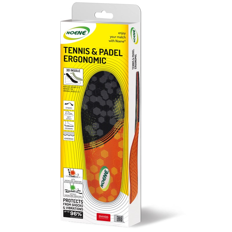 Plantari Noene Ergonomic Sport per il tennis ed il padel, ideali per chi pratica attività intense e dinamiche come i giocatori di padel , beach padel, pickleball e tennis . I plantari 3D INSOLE TENNIS & PADEL ERGONOMIC hanno un doppio strato AIRFOAM ed E.V.A per assicurare al piede comfort ed elasticità. Inoltre la forma ergonomica del rinforzo in E.V.A (arancione), guida il tallone e la volta plantare nei cambi di direzione e nei salti. Proteggono con uno strato di 1 mm di Noene ® a tutta lunghezza e un inserto specifico per il tallone, per un totale di 5mm. La base tridimensionale migliora l'aderenza all'interno della calzatura, donando stabilità al piede e una performance migliore. Sostituiscono la soletta originale (3D INSOLE). Salbini articoli tecnici per lo sport è rivenditore ufficiale di plantari Noene .