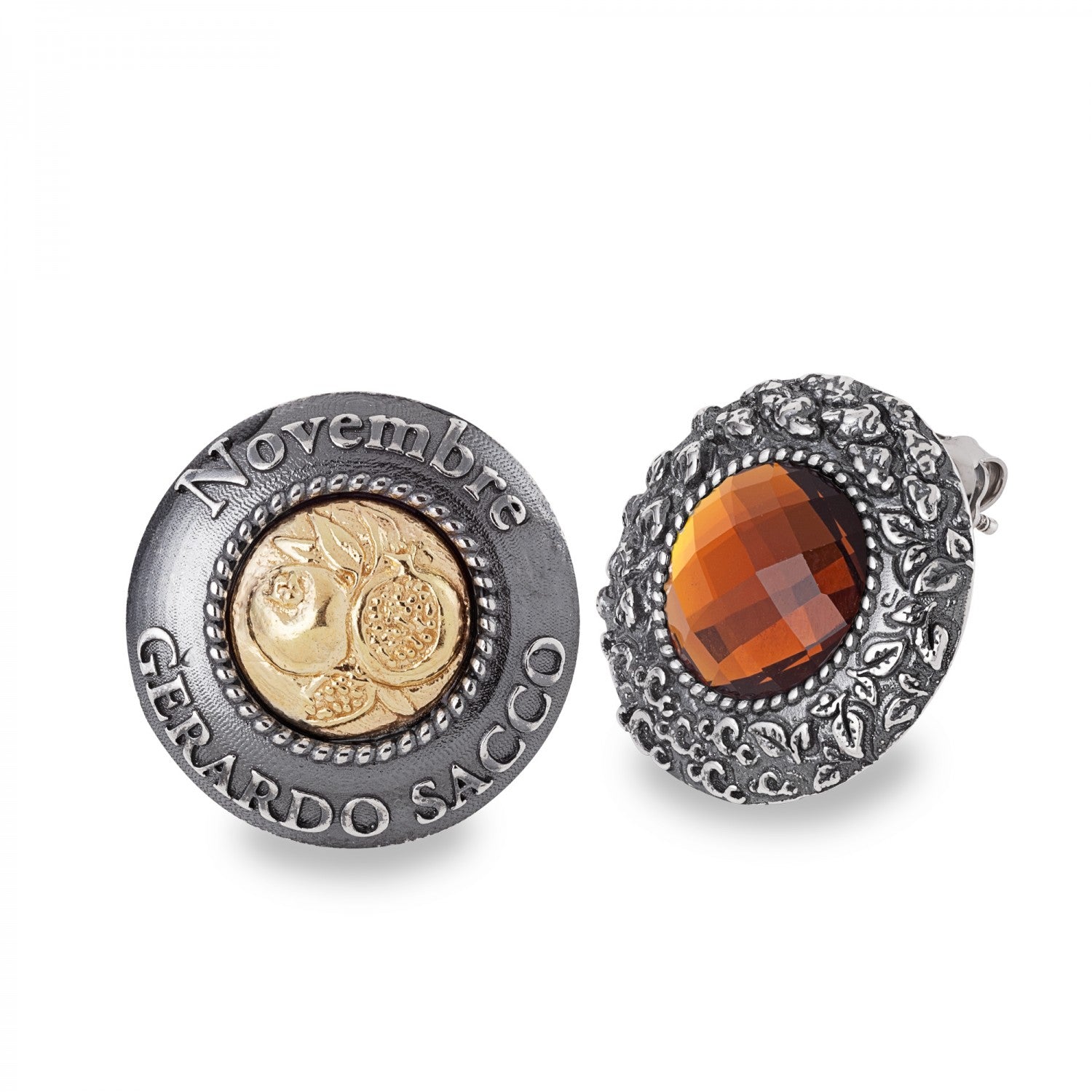 Orecchini a lobo in Argento 925/000 con simbolo del mese e pietra colore ambra. La coppia è realizzata secondo la nuova tendenza mismatched, con un orecchino diverso dall'altro, in modo da presentare da una parte il simbolo del mese, il melograno in argento placcato Oro 24 kt, e sull'altro un cristallo sfaccettato ambra, colore dell'Autunno.