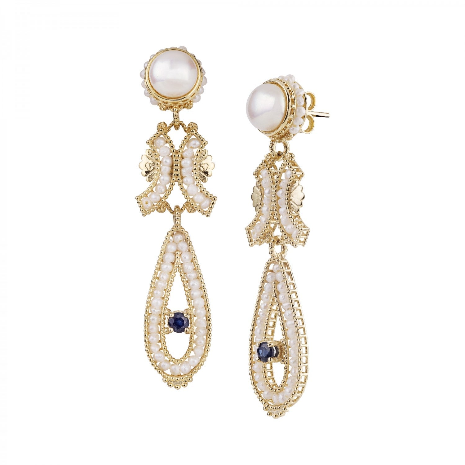 Orecchini Donna Gerardo Sacco in Oro con Zaffiri e Microperle con Perla Centrale - 14294