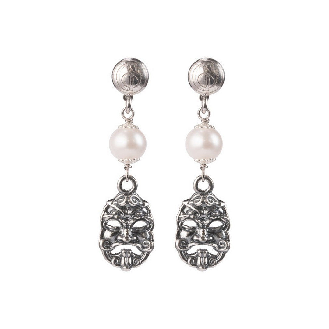 Orecchini pendenti dalla delicata e raffinata manifattura. Una maschera porta fortuna in argento, accompagnata da un'elegante perla per rendere  sofisticata ogni tua mise.