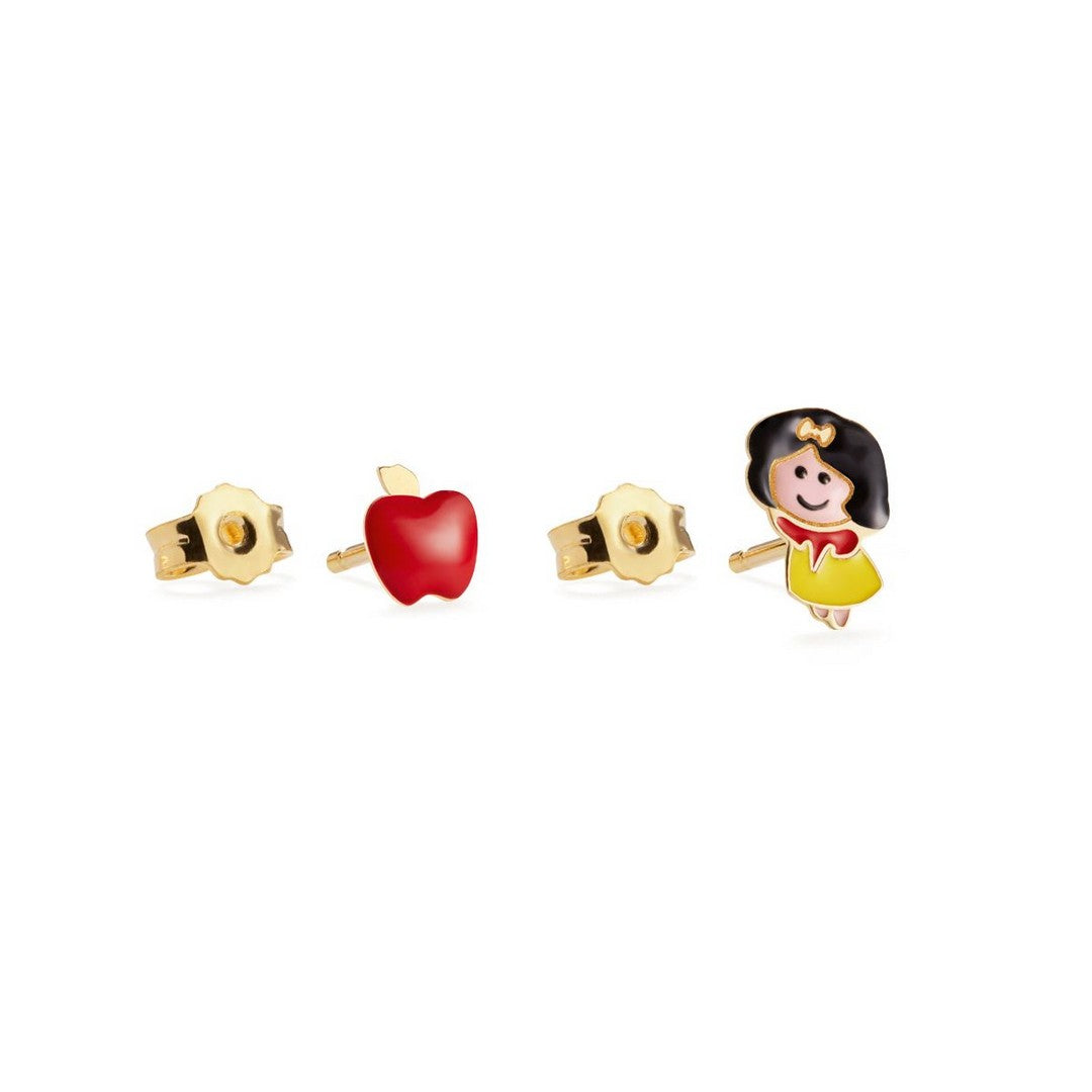 Orecchini "Fiabe" in oro giallo 9kt con elemento ispirato a Biancaneve e mela smaltati.