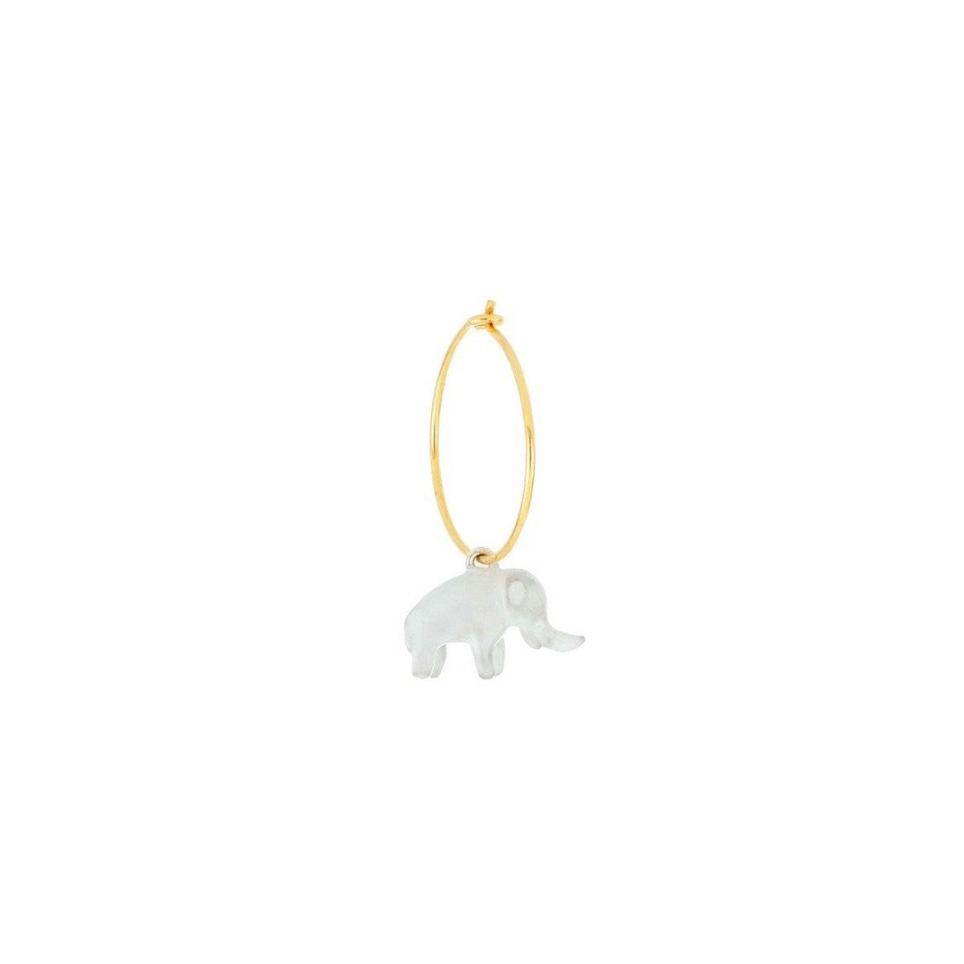 Orecchino a cerchio singolo in argento 925 con galvanica oro giallo ad alto spessore e resistenza. L'orecchino ha un diametro di 19 mm e presenta un elefante pendente smaltato in bianco. Lunghezza totale dell'orecchino 30 mm.