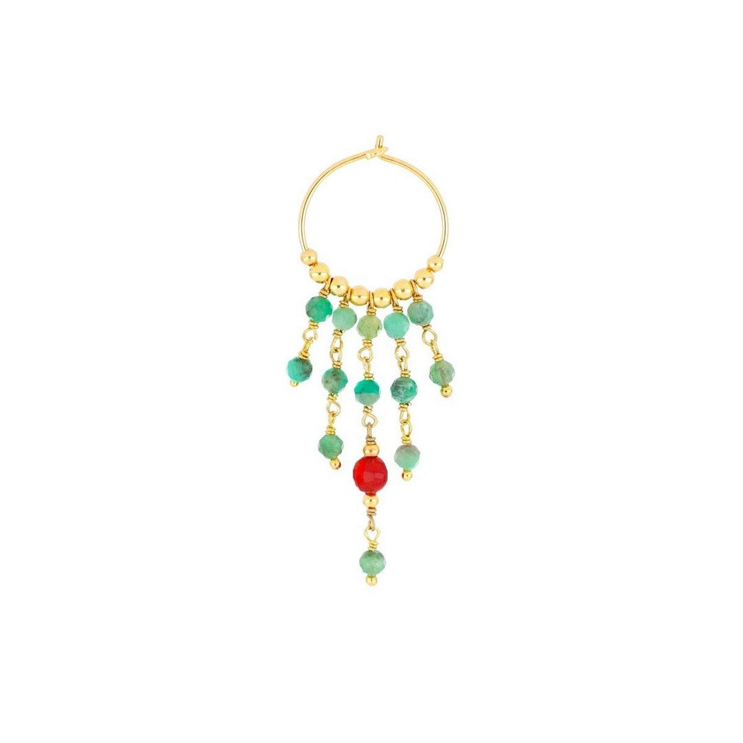 Orecchino a cerchio singolo con cascata di pietre di smeraldo, pietra di corniola e sfere decorative in argento.