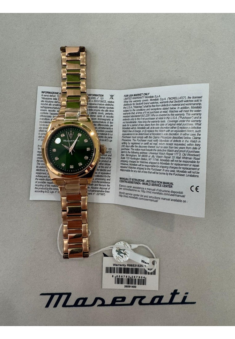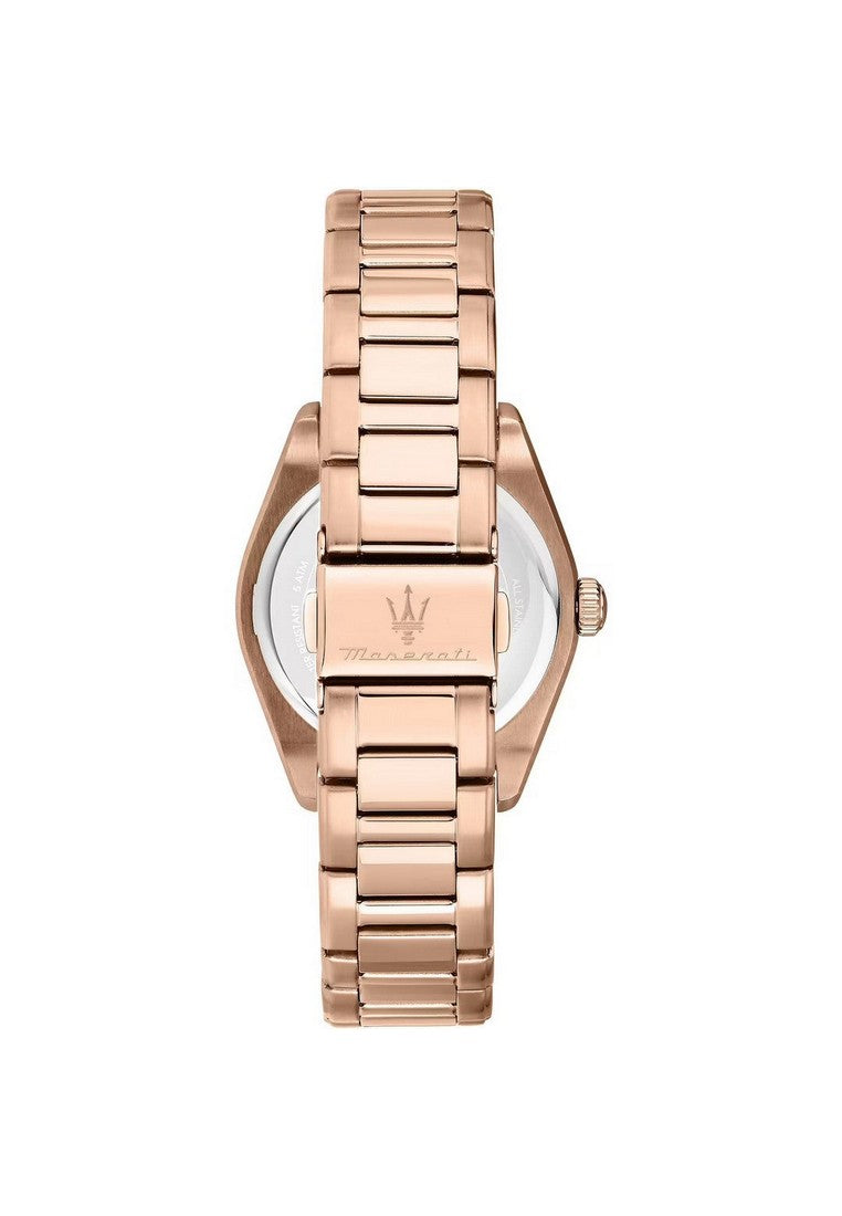 OROLOGIO MASERATI VELOCITA' ? R8853152501 ? Genere: Donna, Materiale e finitura cassa: Acciaio, Misura cassa: 35.00mm, Spessore cassa: 9.00mm, Finitura cassa: Lucido, Colore cassa: Oro rosa, Vetro: Vetro minerale, Materiale cinturino: Acciaio, Colore cinturino: Oro rosa, Chiusura: Fibbia deployante con pulsanti, Movimento: Quarzo, Water resistant: 5 atm, Garanzia: Ufficiale 2 anni Maserati, Confezione: Originale Maserati