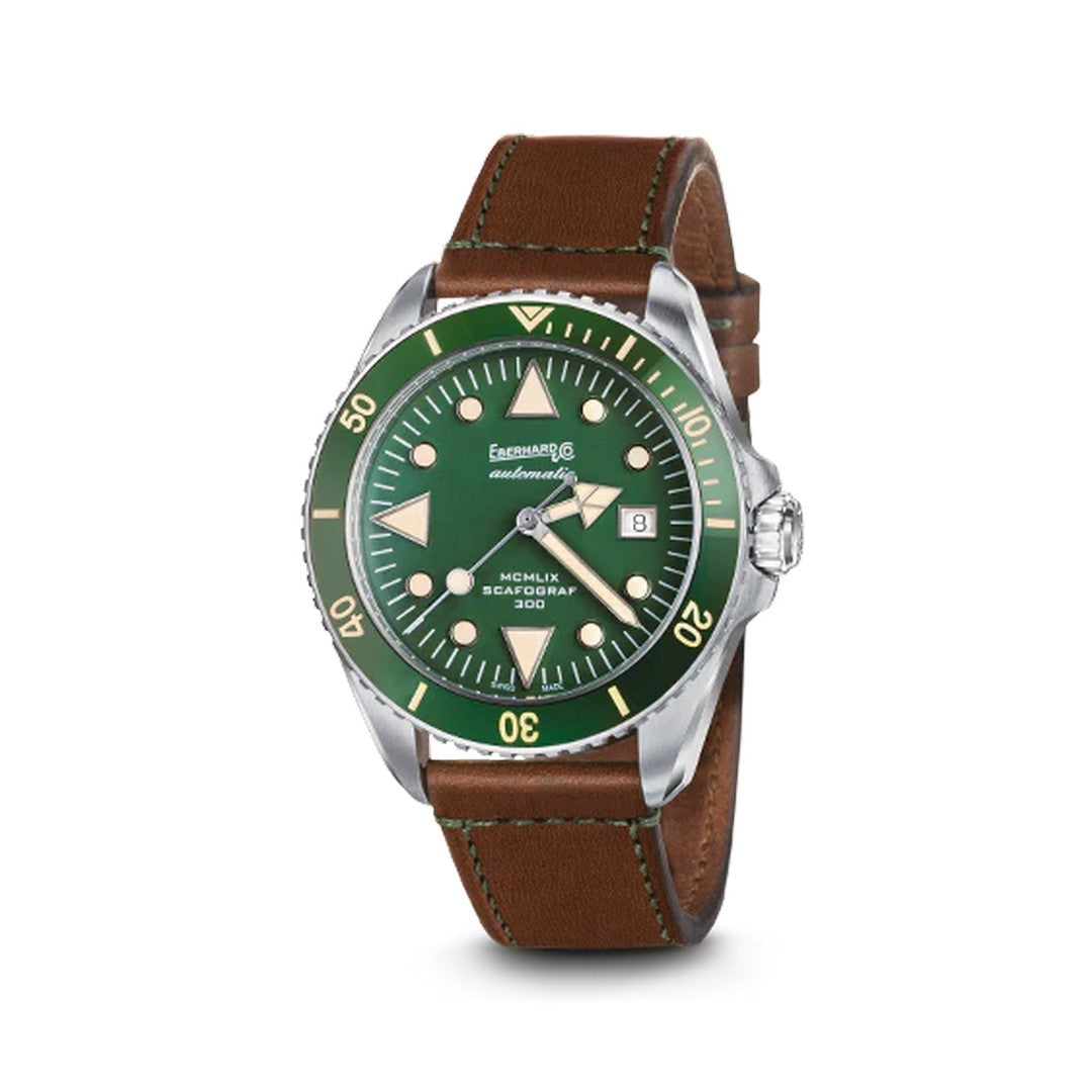 Scafograf 300 MCMLIX celebra l'anno di presentazione della collezione Scafograf nel 1959, che divenne uno dei maggiori successi di Eberhard & Co. Orologio meccanico a carica automatica, con cassa in acciaio del diametro di 43 mm, Scafograf 300 MCMLIX nella nuova versione con quadrante verde. Sul quadrante e sulla lunetta girevole in ceramica verde risalta la particolare luminescenza vintage.Ref 41034-VS CA. Cinturino in pelle e bracciale acciaio in dotazione.