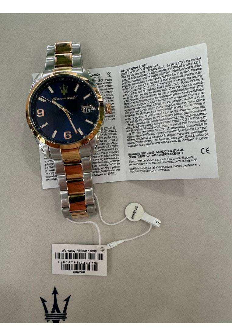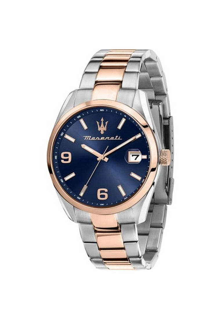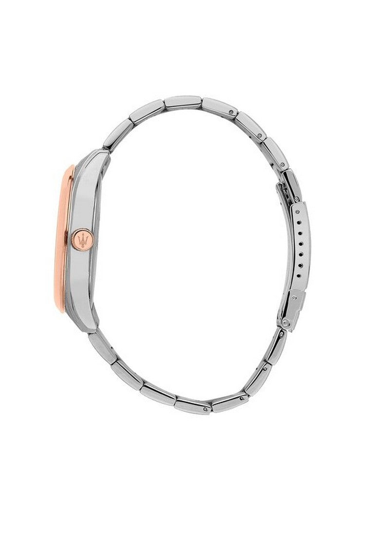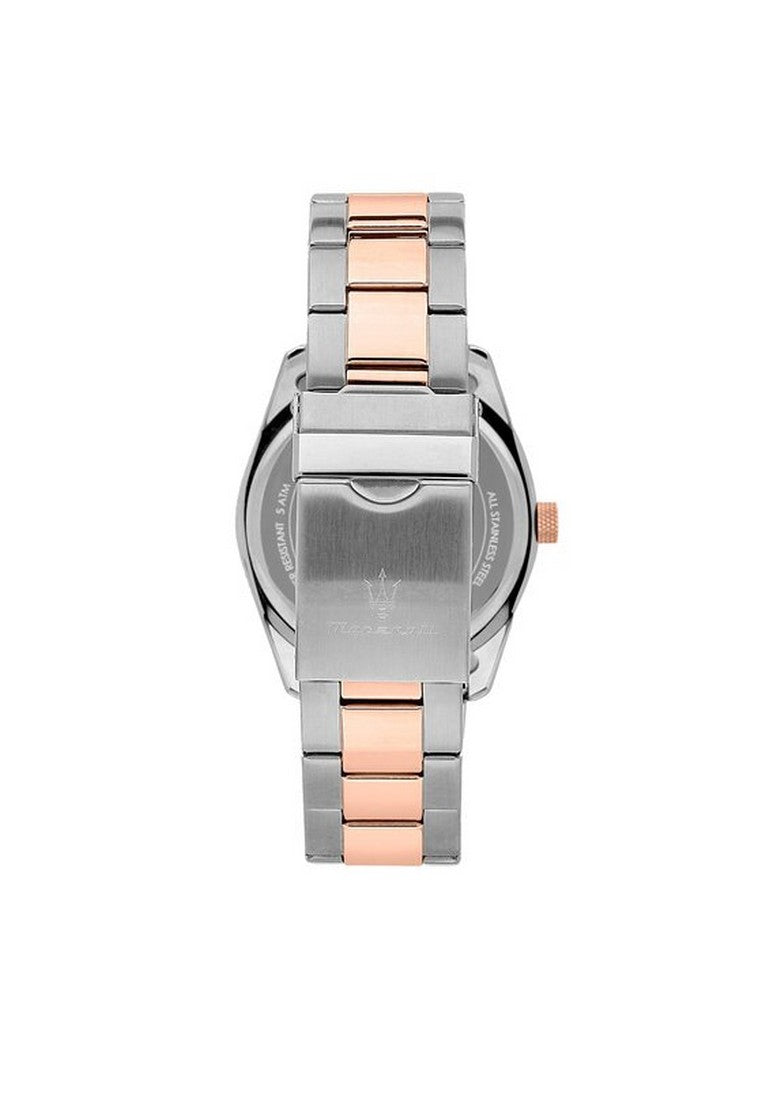 L'orologio è dotato di funzioni di data e ora, offrendo comodità e praticità. Il logo Maserati impreziosisce il quadrante, esaltando lo stile inconfondibile del marchio. La combinazione di elementi in argento e oro rosa aggiunge un tocco di lusso al design, rendendolo un vero pezzo di tendenza.