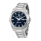 Quadrante analogico blu con indici a bastoni, logo a ore 12 e datario a ore 3 con giorno del mese e della settimana. Vetro zaffiro.