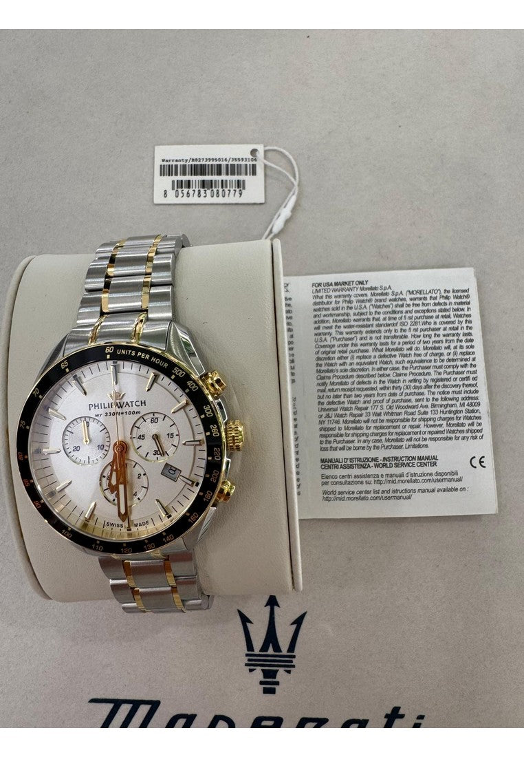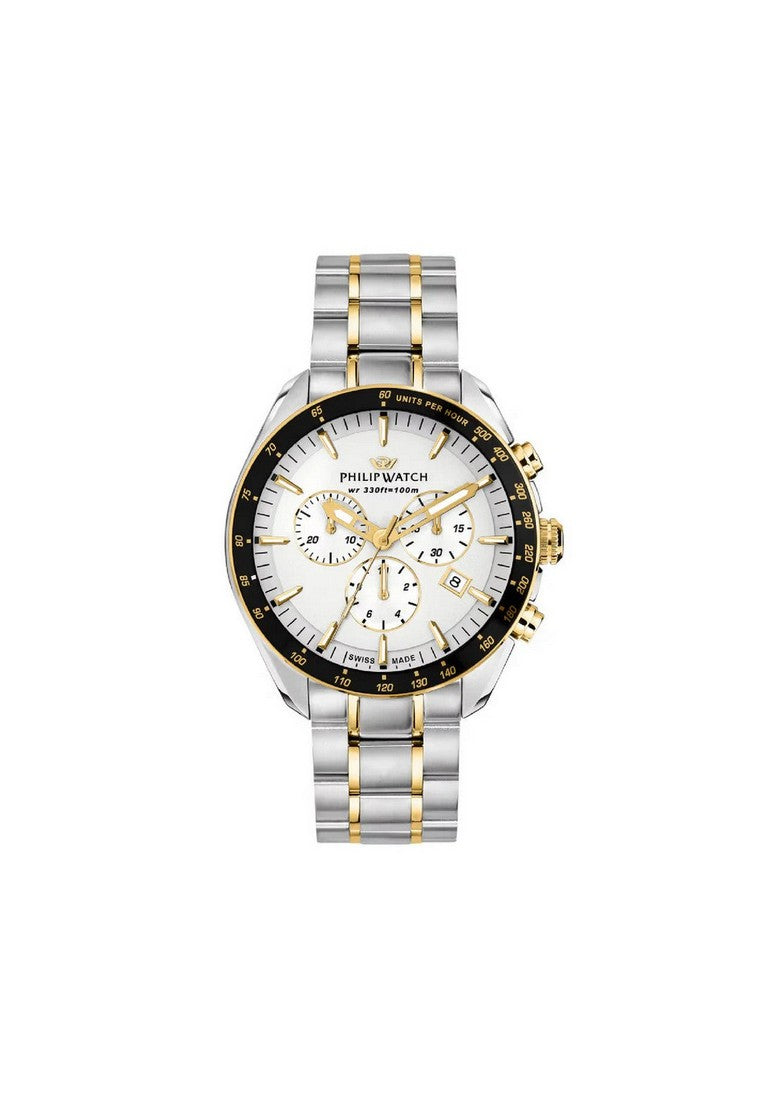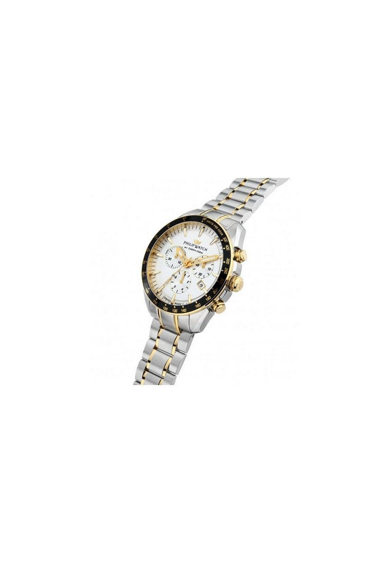 Orologio cronografo della collezione Philip Watch Blaze Sport da uomo. Colore cassa: argento; colore del quadrante: bianco; colore del bracciale: argento e oro. Cassa di diametro 42 mm in acciaio inossidabile 316L, quadrante con datario e lunetta di colore nero. Vetro zaffiro antiriflesso. Bracciale in acciaio inossidabile 316L con trattamento pvd oro sulle maglie centrali e con chiusura deployante. Movimento al quarzo. Classificazione di impermeabilità (WR) 10 bar: adatto al nuoto, allo yachting, allo snorkeling, alla nautica. Swiss made.