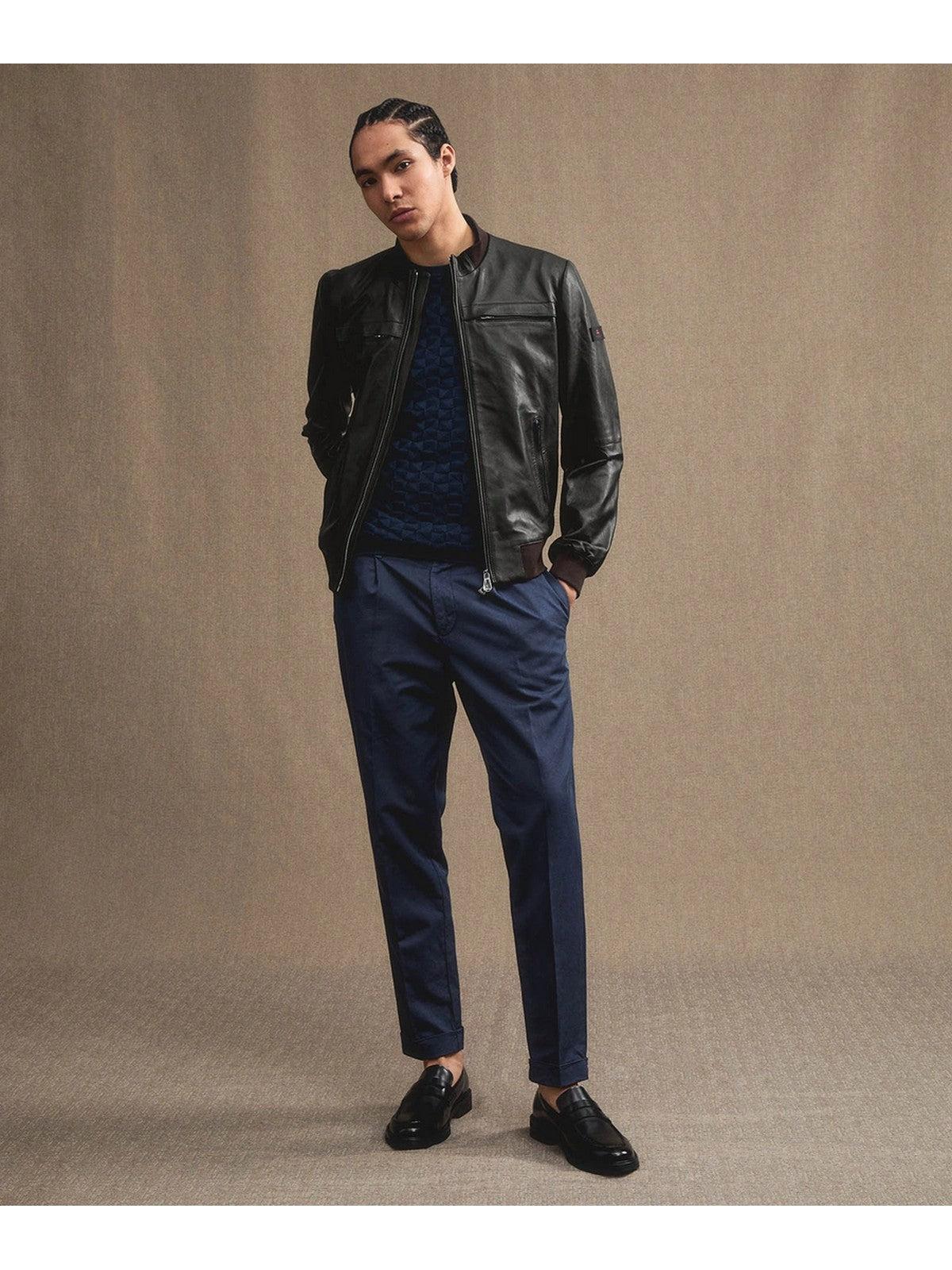 Giacca PEUTEREY in pelle morbida e confortevole. Chiusura centrale con zip metallica a doppio cursore. Collo in piedi e maniche lunghe. Doppie tasche laterali e al petto con zip. Polsini, fondo e collo in maglia.