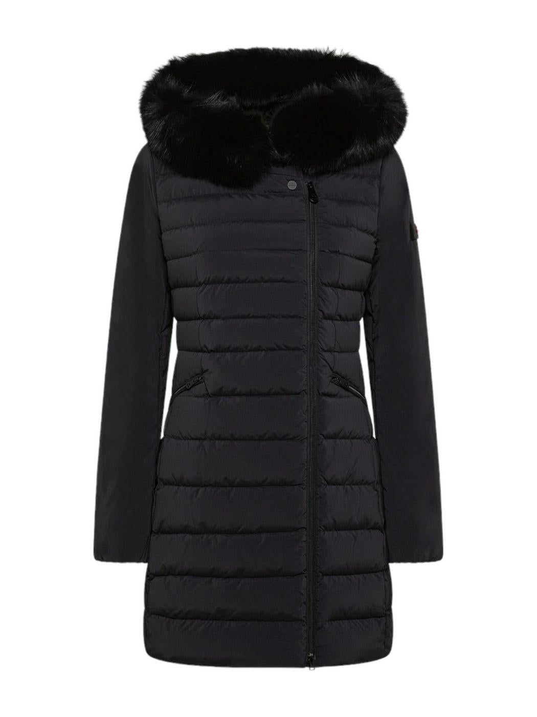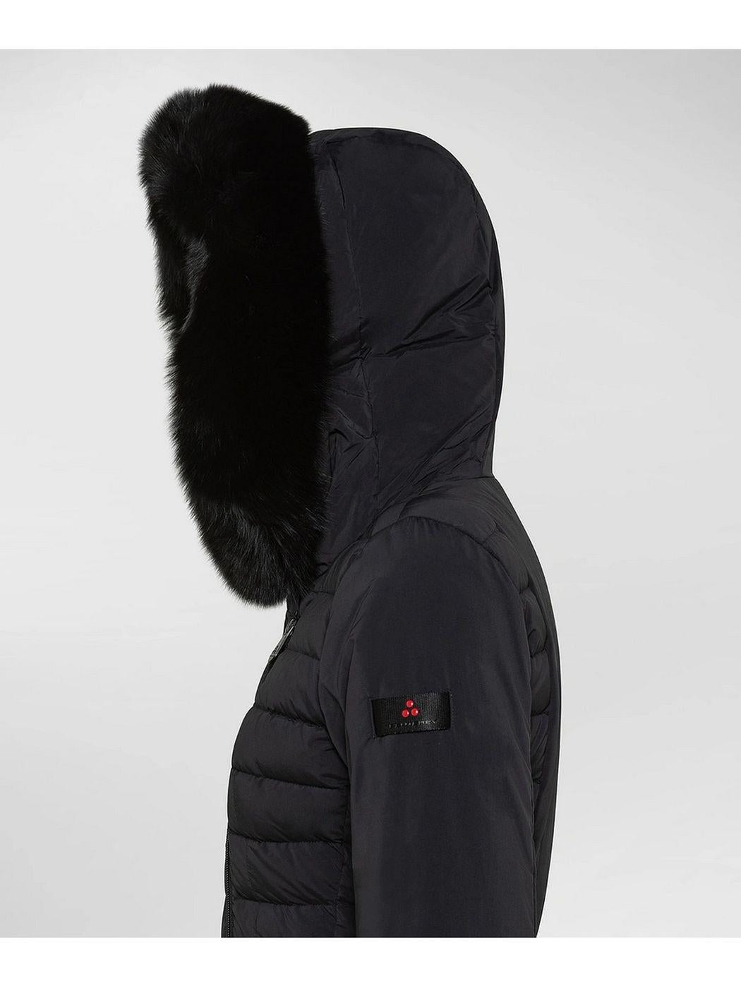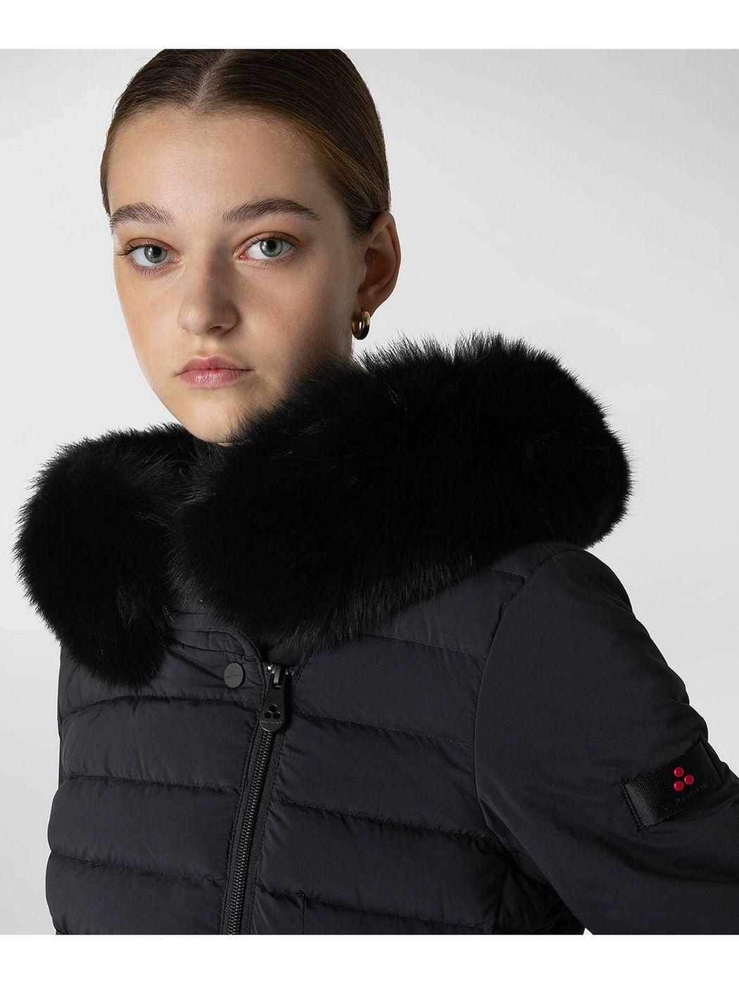 Piumino slim Peuterey in tessuto tecnico leggero con piuma naturale. Cappuccio, vera pelliccia removibile. Chiusura con zip asimmetrica a doppio cursore, tasche con zip, inserti elastici antivento ai polsi. Presenta una coulisse posteriore in vita.