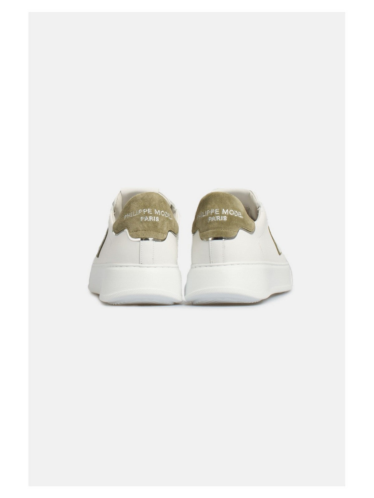 Sneaker PHILIPPE MODEL in vitello con spoiler a contrasto in camoscio piping argentato, profilo dello scudo verde a contrasto.