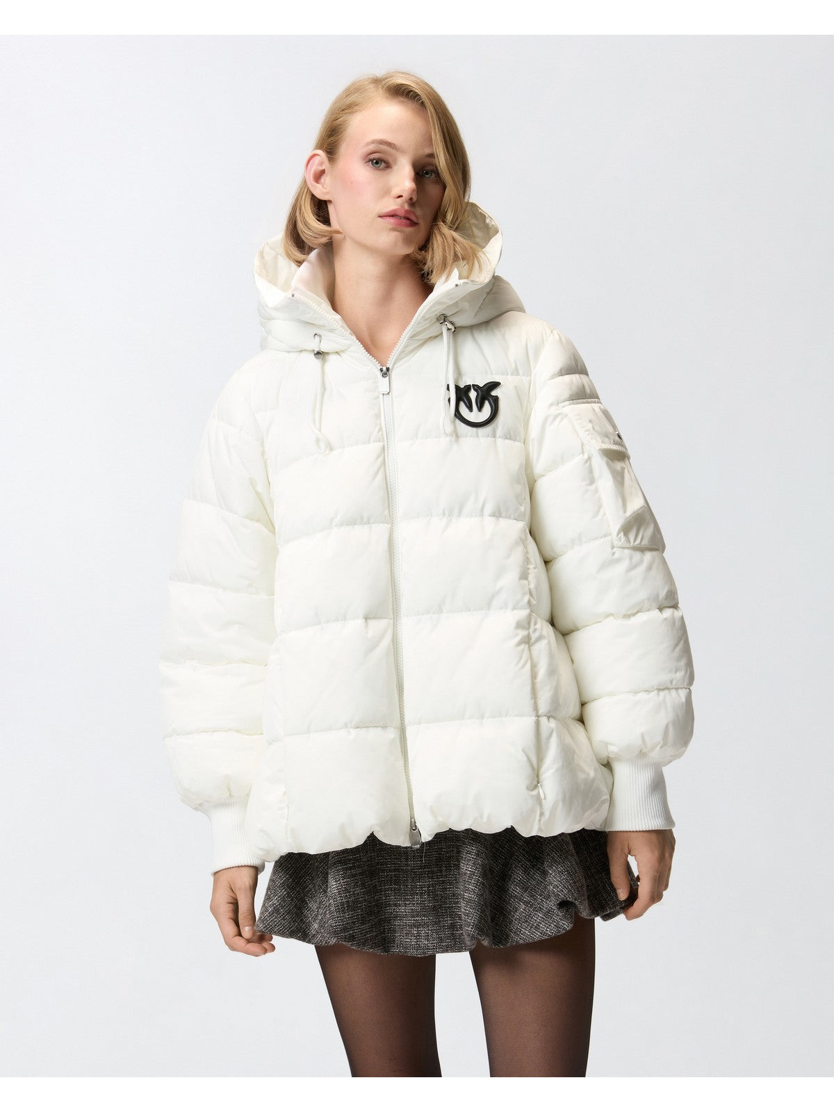 Piumino corto PINKO imbottito in tela tecnica dalla silhouette leggermente a campana. Finishing opaco del tessuto.