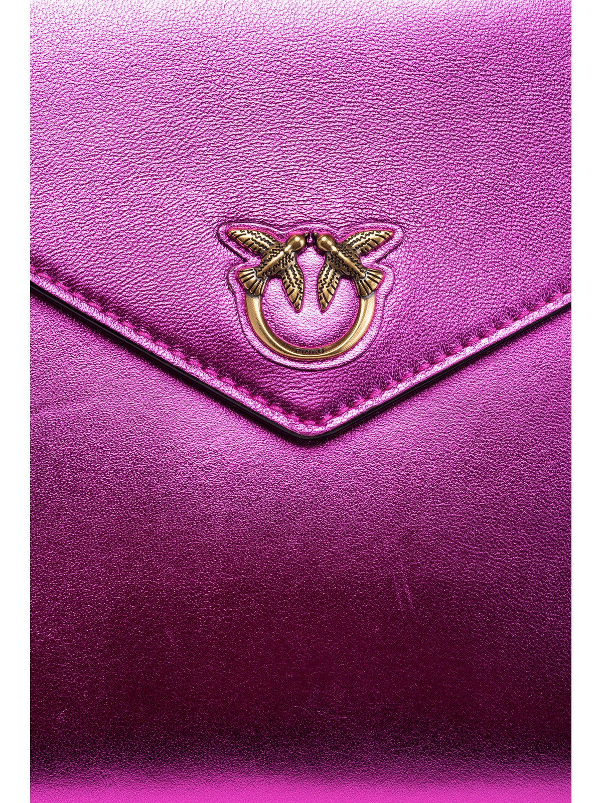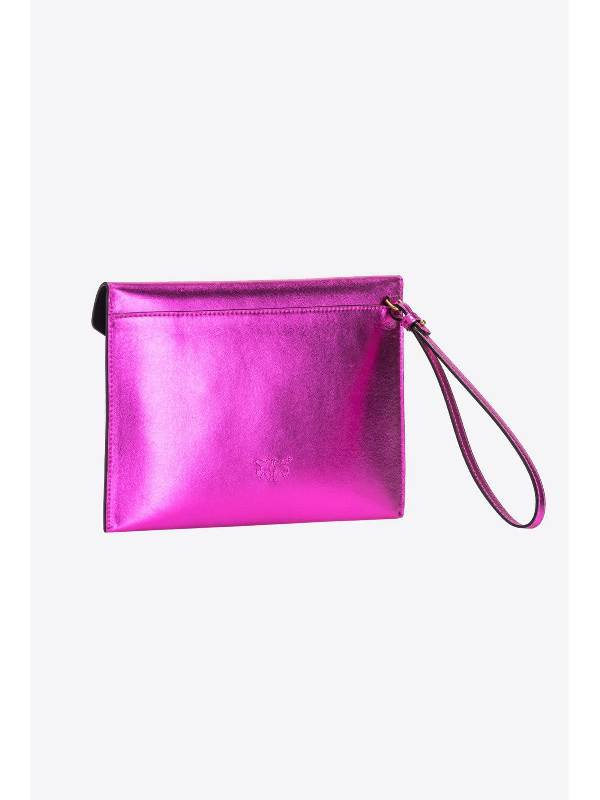 Borsa pochette PINKO Flat Bag in nappa laminata con design a busta. Chiusura cin patta e bottone automatico, personalizzata con placchetta logo Love Birds Diamond Cut davanti. Completo di cinturino per portata al polso.