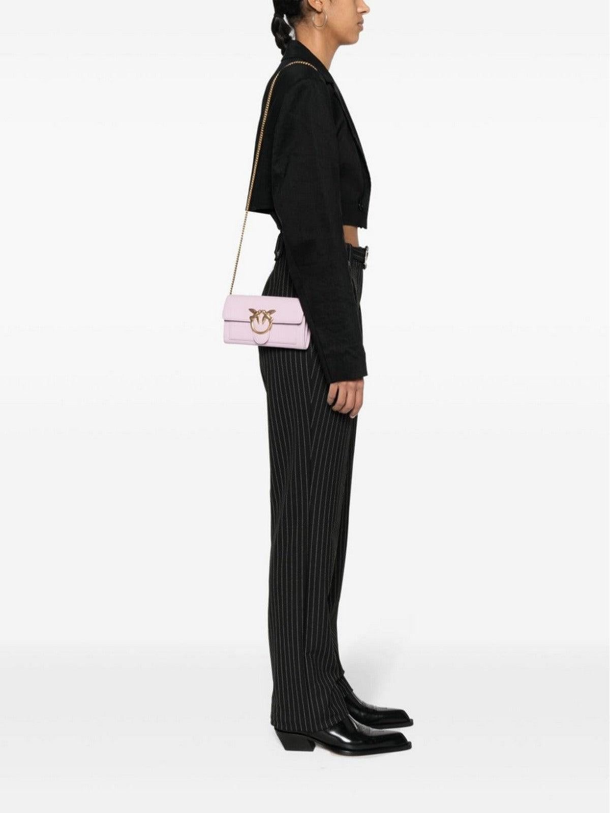 Portafoglio PINKO Love Bag in morbida pelle mano seta. Chiusura con patta e bottone nascosto completata dall'iconica fibbia in metallo Love Birds Diamond Cut. Interno foderato in microfibra e comprende tre scomparti di cui uno chiuso con zip e spazi per carte di credito, banconote e documenti. Tracolla metallica a catena che permette di portare il portafoglio come una borsa crossbody, ed è rimovibile.