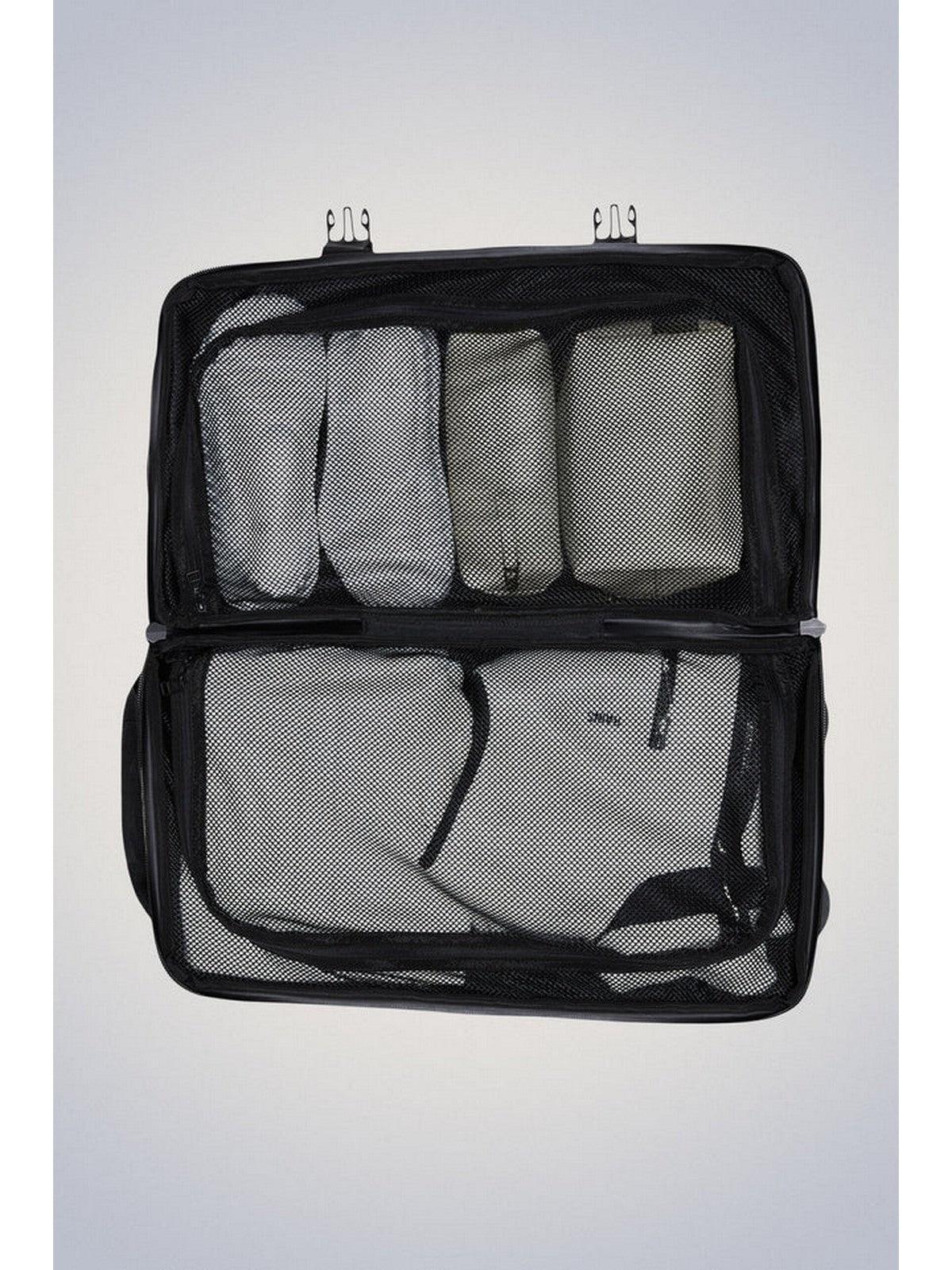 Trolley da viaggio RAINS nelle dimensioni del bagaglio a mano, realizzato in PU. Presenta due scomparti principali, uno con fasce elastiche trasversali ed entrambi con chiusure in mesh. Dotata di un manico telescopico e di manici in alto e di lato. Il design è rifinito con tasca frontale con cerniera, per un facile accesso a passaporti, chiavi e altri elementi essenziali. Manicotti per trolley, che possono essere fatti scorrere sul manico telescopico per un facile trasporto. Due ruote. Chiusura con zip.