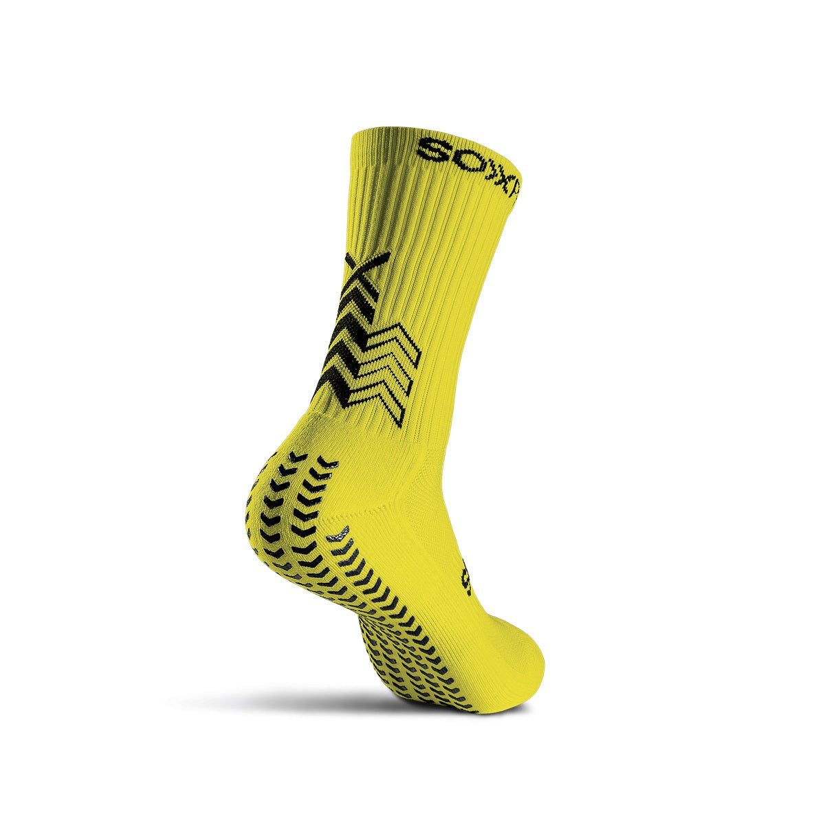 Calza tecnica antiscivolo SOXPro Classic imbottita con altezza a metà polpaccio. I calzini da calcio SOXPro Classic Soccer Grip sono progettati per un supporto durante tutte le tue prestazioni sportive, riducendo l'attrito tra la suola e la scarpa. Queste calze Soxpro sono progettate per offrire la massima trazione all'interno della scarpa, caratterizzate dalla presenza di cuscinetti in silicone antiscivolo a forma di freccia. Le frecce, presenti sulla pianta del piede e nella zona strategica del tallone, generano un'azione Grip:IN che non consente alcuno scivolamento all'interno della scarpa. Questo impedisce i fastidiosi movimenti laterali e verticali che si verificano all'interno della scarpa quando si pratica qualsiasi sport. Grazie all'utilizzo dell'innovativo tessuto DRY FLEX , le calze SOXPro Classic grip sono flessibili e traspiranti. Tessuto che garantisce, oltre alla traspirabilità e alla flessibilità, anche il massimo comfort e ventilazione. Salbini articoli tecnici per lo sport è rivenditore Soxpro .