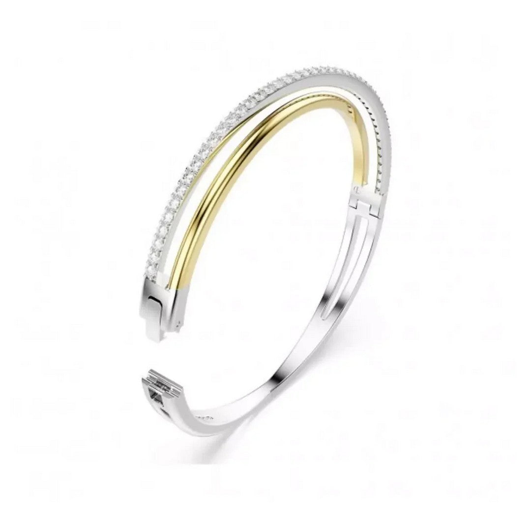Braccialetto rigido realizzato in lega di metalli con finitura rodiata e dorata e impreziosito da cristalli swarovski.