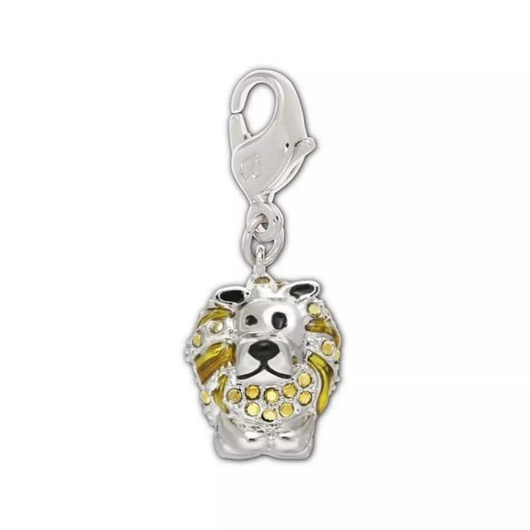 Questo ciondolo a forma di leone è realizzato in metallo placcato rodio impreziosito da cristalli e smalto in resina epossidica