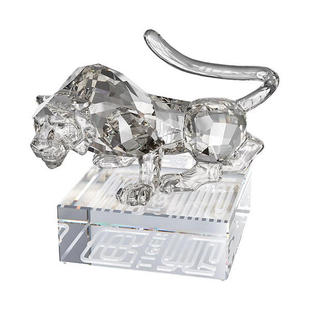 Un potente segno zodiacale cinese, la tigre è sinonimo di dinamismo, carisma e vigore. Nel cristallo Silver Shade sfaccettato e non sfaccettato, gli occhi della tigre brillano nel cristallo Moroda Sahara. La sua base sfaccettata in cristallo trasparente, con finitura opaca incisa, presenta il nome dello zodiaco in caratteri inglesi e cinesi.