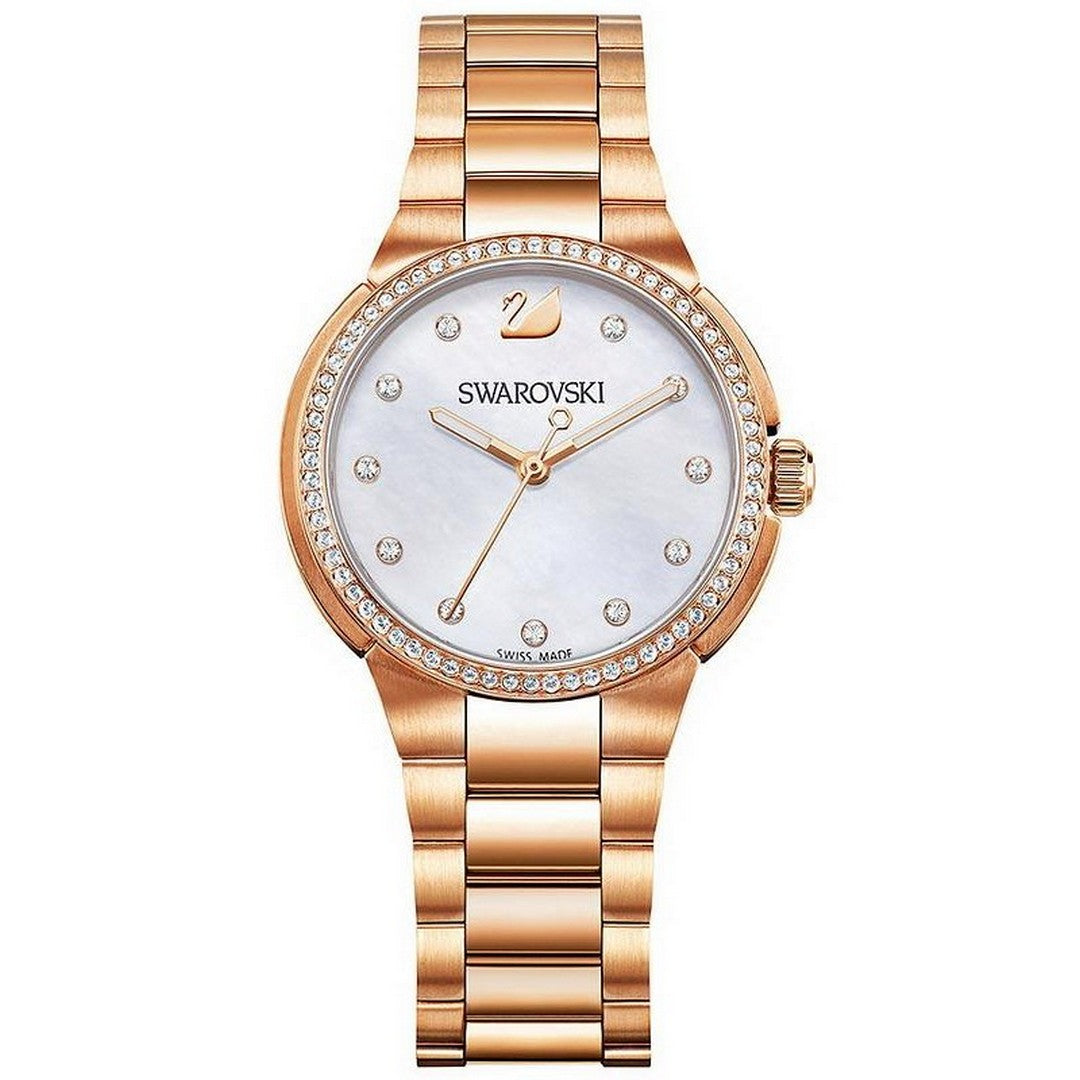 Orologio Solo Tempo Da Donna Di Swarovski Della Collezione City. Modello Con Pietre Clear Crystale Placcatura Oro Rosa. Questo Orologio Ha Cassa In Acciaio Con 68 Clear Crystal Fissati Sulla Lunetta. E Cinturino In Acciaio Con Finitura Oro Rosa. Quadrante Madreperla. Orologio Impermeabile Fino A 50 M; Swiss Made. La Referenza È 5221176