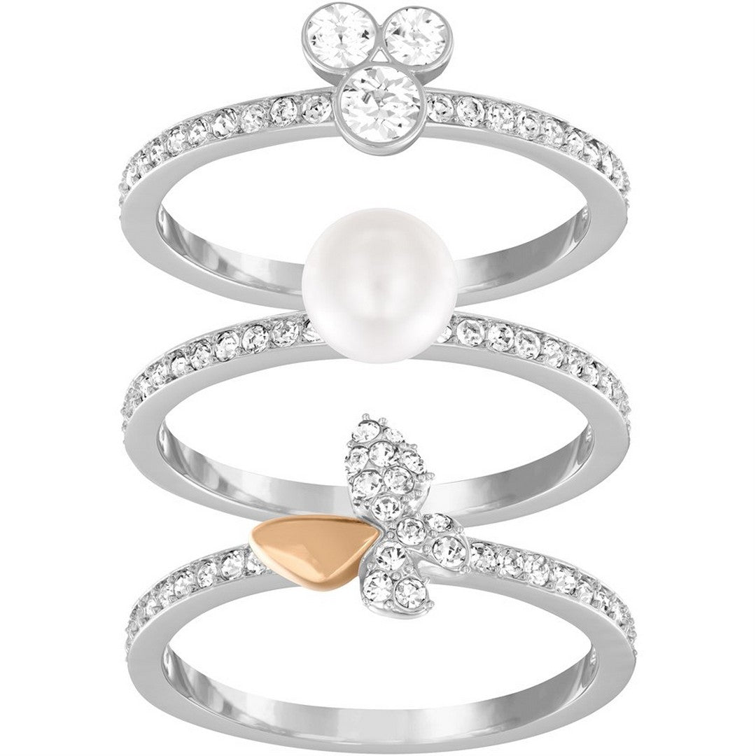 Ispirati alle farfalle e ai fiori estivi, i graziosi gioielli Swarovski aggiungono un tocco giocoso a ogni outfit. Questo set di tre anelli è ornato da piccoli dettagli in cristallo trasparente e da una combinazione di rodio e oro rosa.