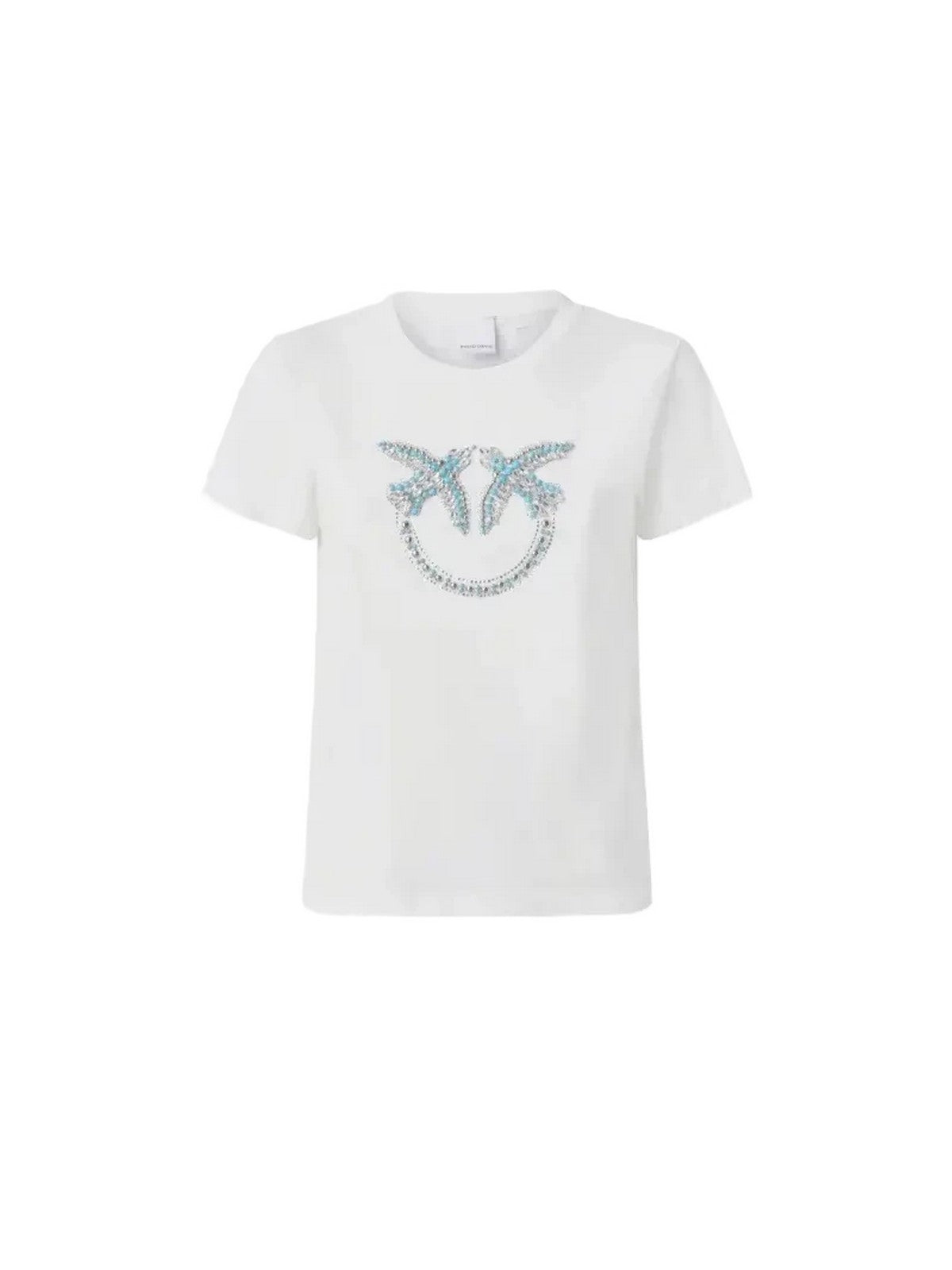 T-shirt Donna Pinko - T-shirt con ricamo logo Love Birds in cristalli - Bianco