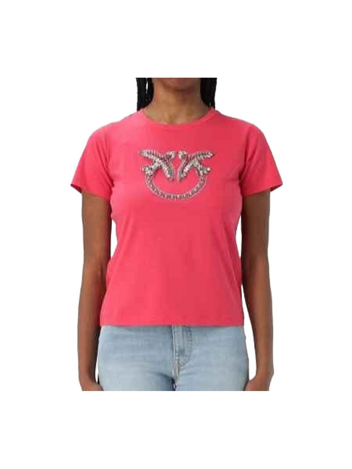 T-shirt da donna a maniche corte in jersey di cotone con maxi ricamo soggetto logo Love Birds davanti, impreziosito con perline e cristalli. L'emblema di PINKO diventa protagonista del capo, regalando anche ai look casual un tocco originale e decisamente scintillante.