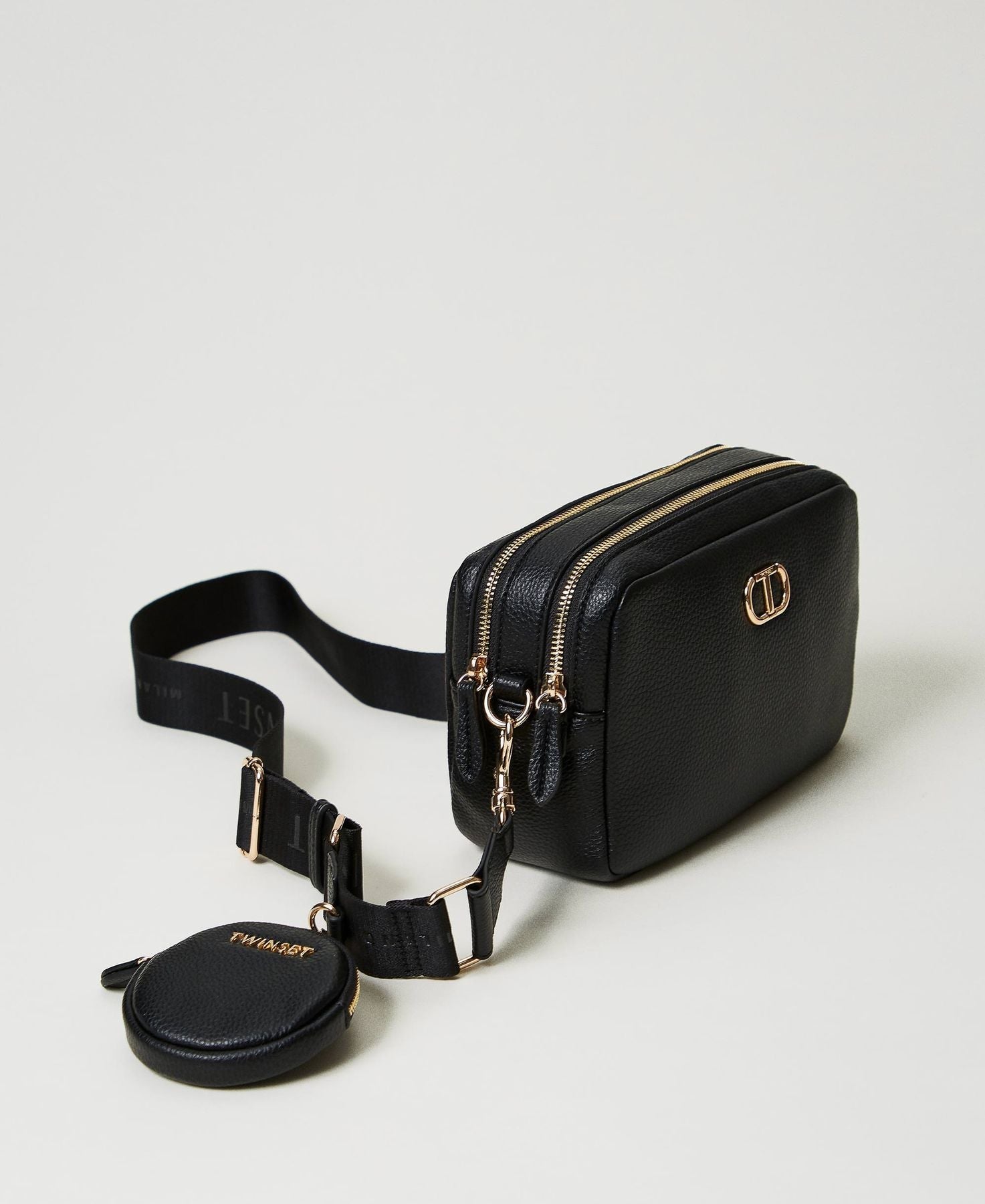? Portamonete a cilindro con zip applicato alla tracolla rimovibile con moschettone