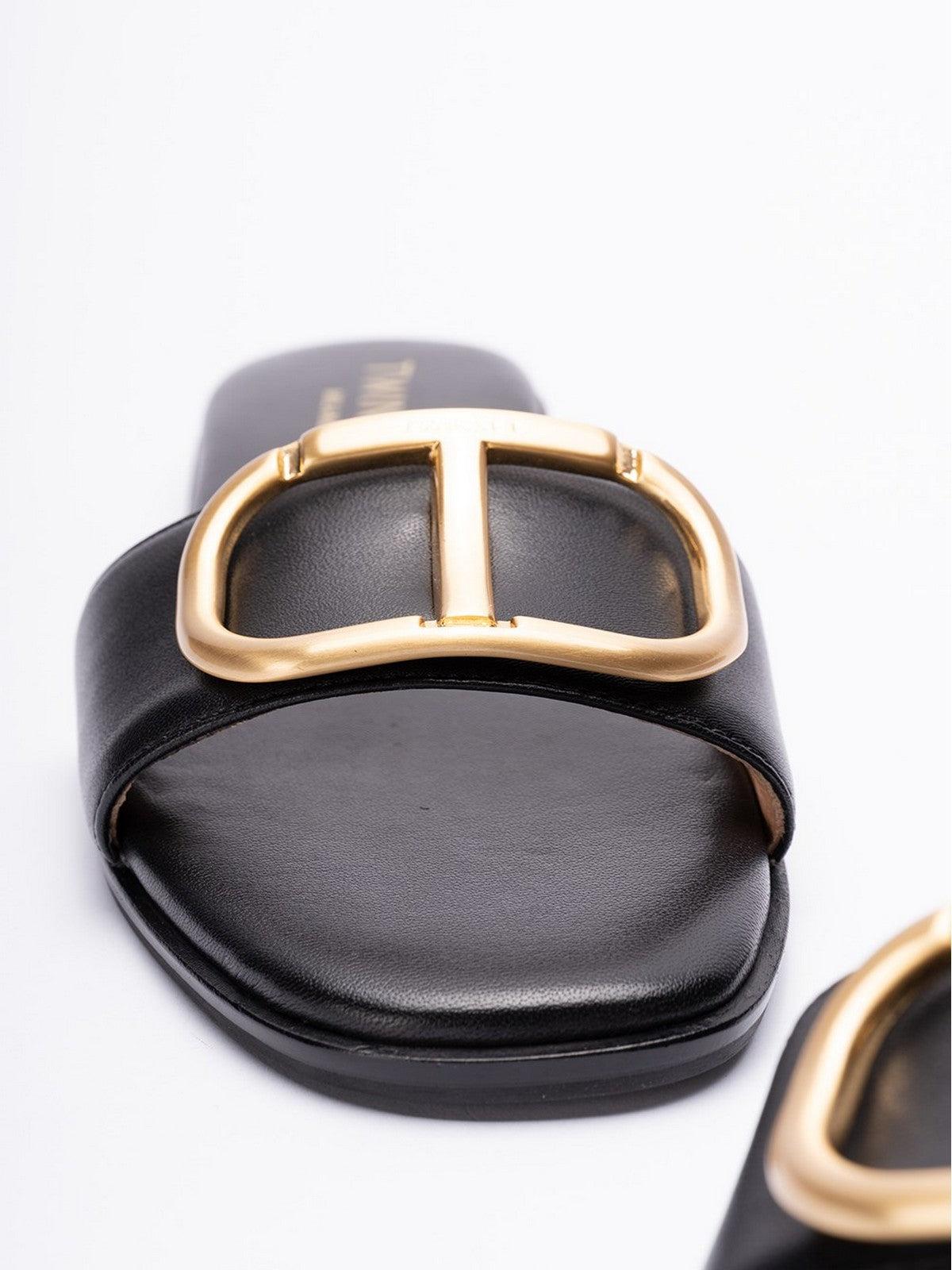Sandali slide TWINSET in pelle con logo Oval T in metallo sul fronte. Fondo in tunit.