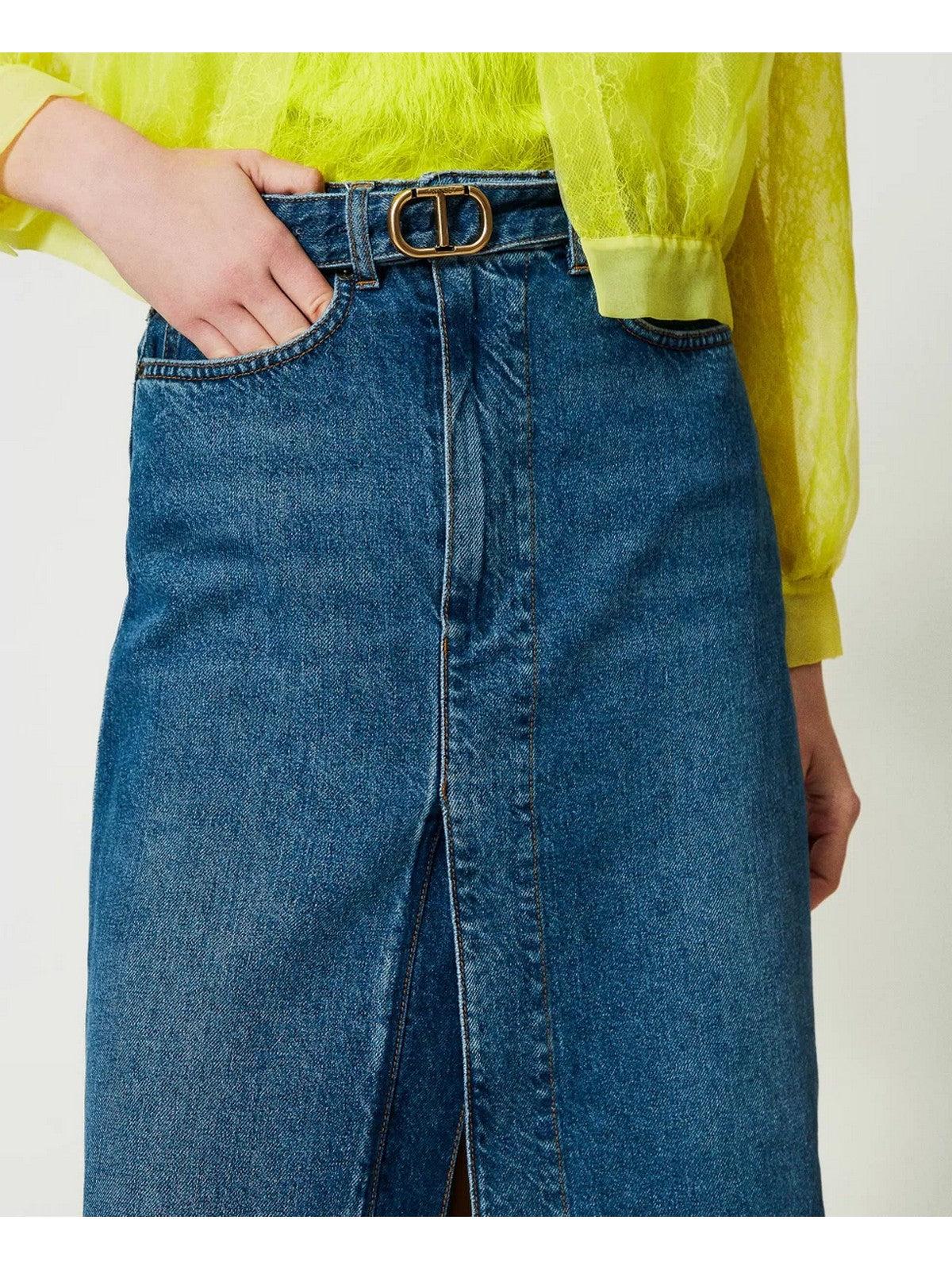 Gonna longuette TWINSET in jeans di cotone indaco con lavaggio stone leggero. Vita regular. Cintura con fibbia logo Oval T in metallo. Cinque tasche. Ampio spacco sul fronte. Linea dritta