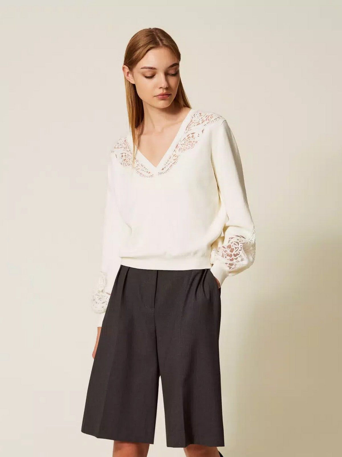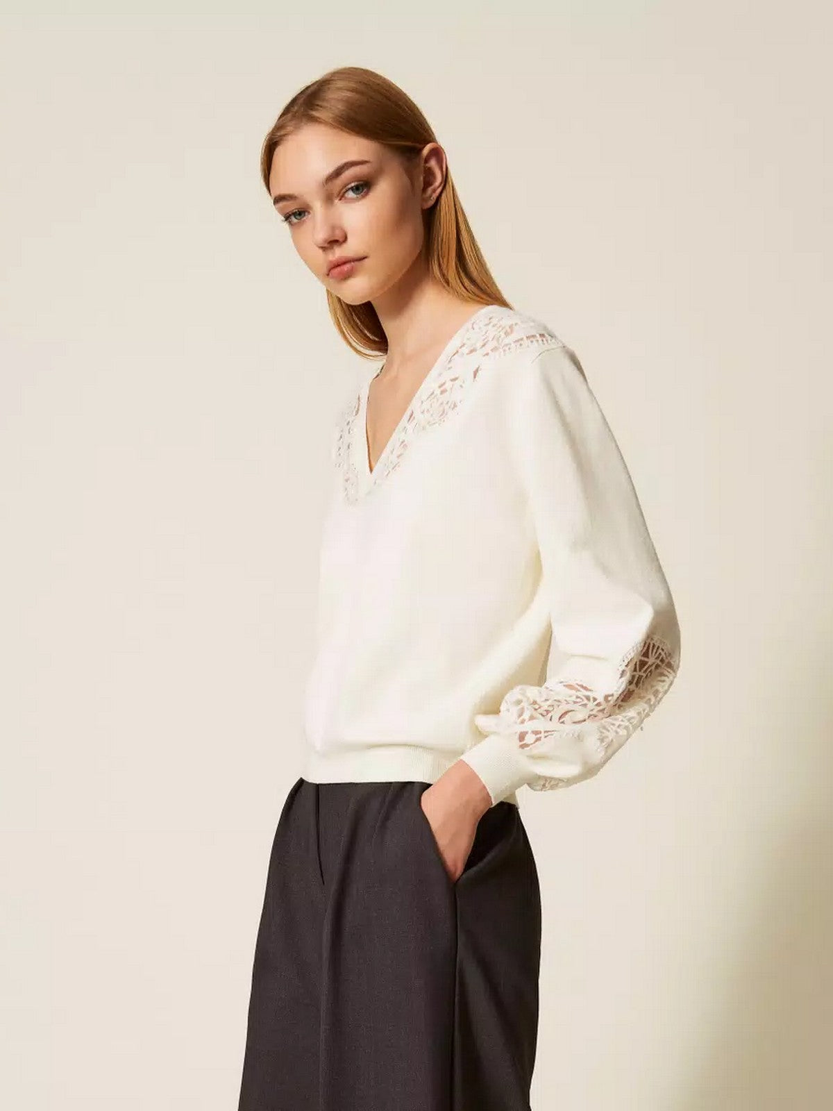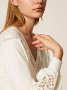 Maglione TWINSET in misto viscosa con intarsio ricamato su base tulle in trasparenza. Ha lavorazione rasata.