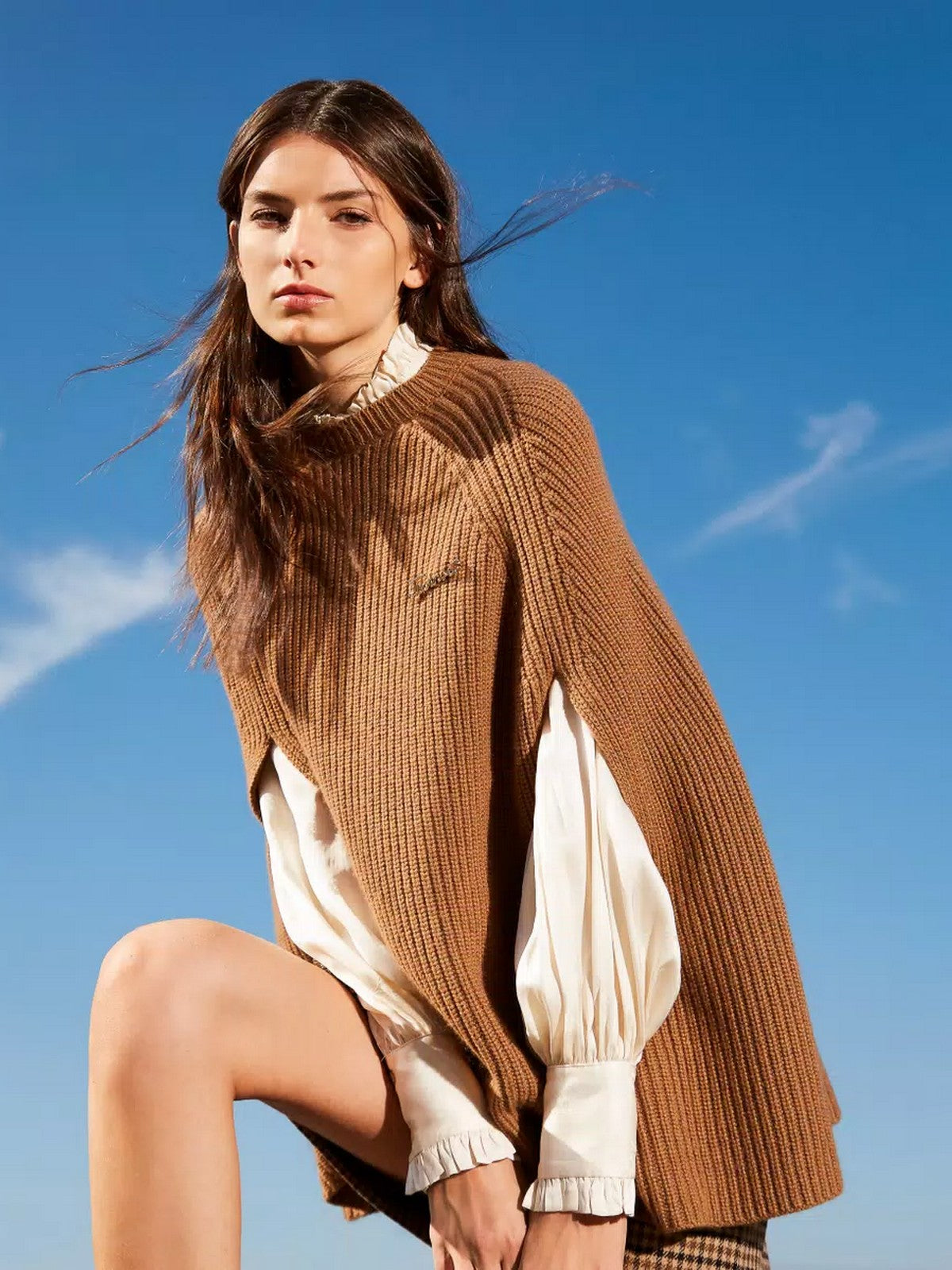 Maglia a mantella TWINSET in misto lana e viscosa con spilla logo rimovibile. Ha lavorazione a punto pannocchia.