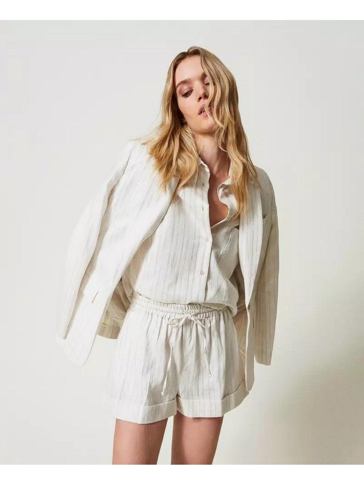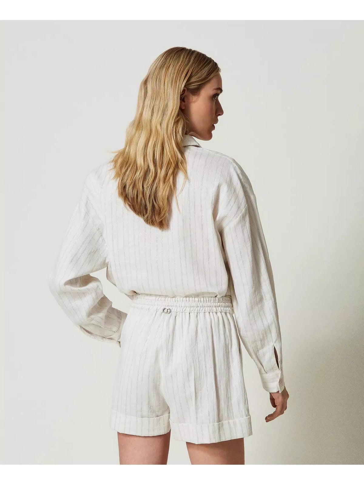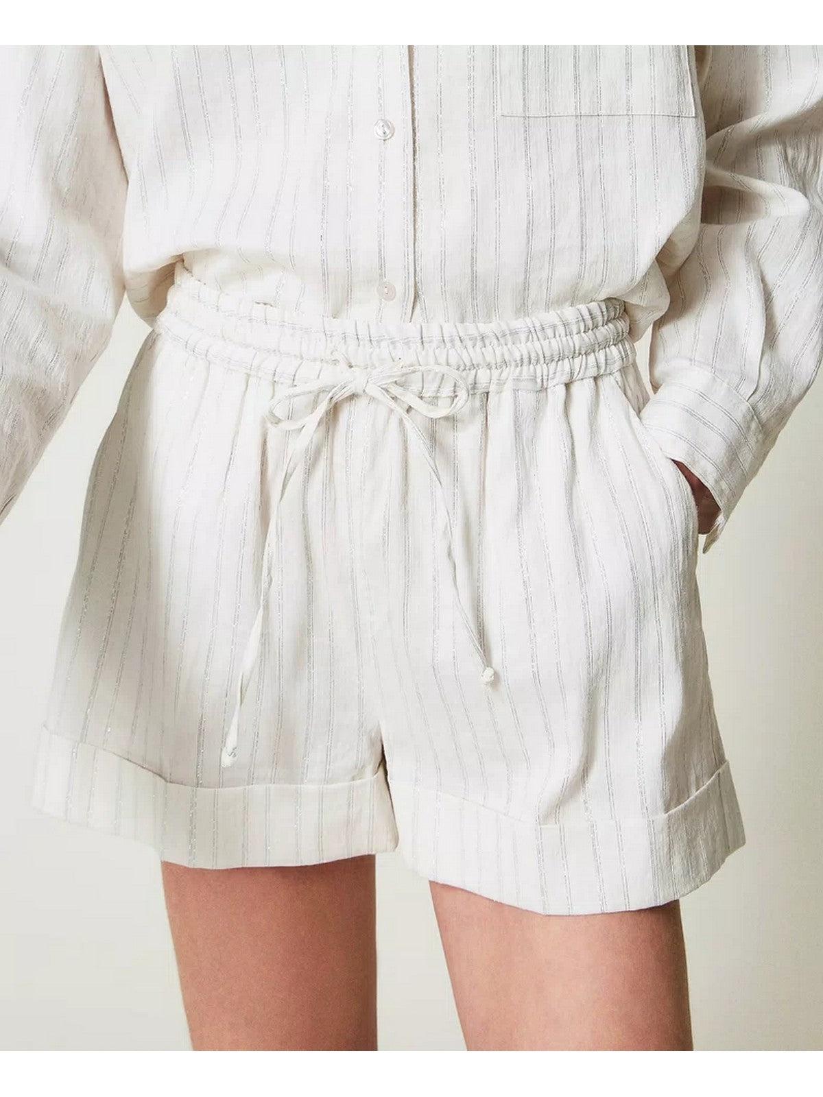 Shorts TWINSET in saia di misto cotone e lino con gessatura a righe lurex. Elastico in vita con coulisse. Tasche alla francese.