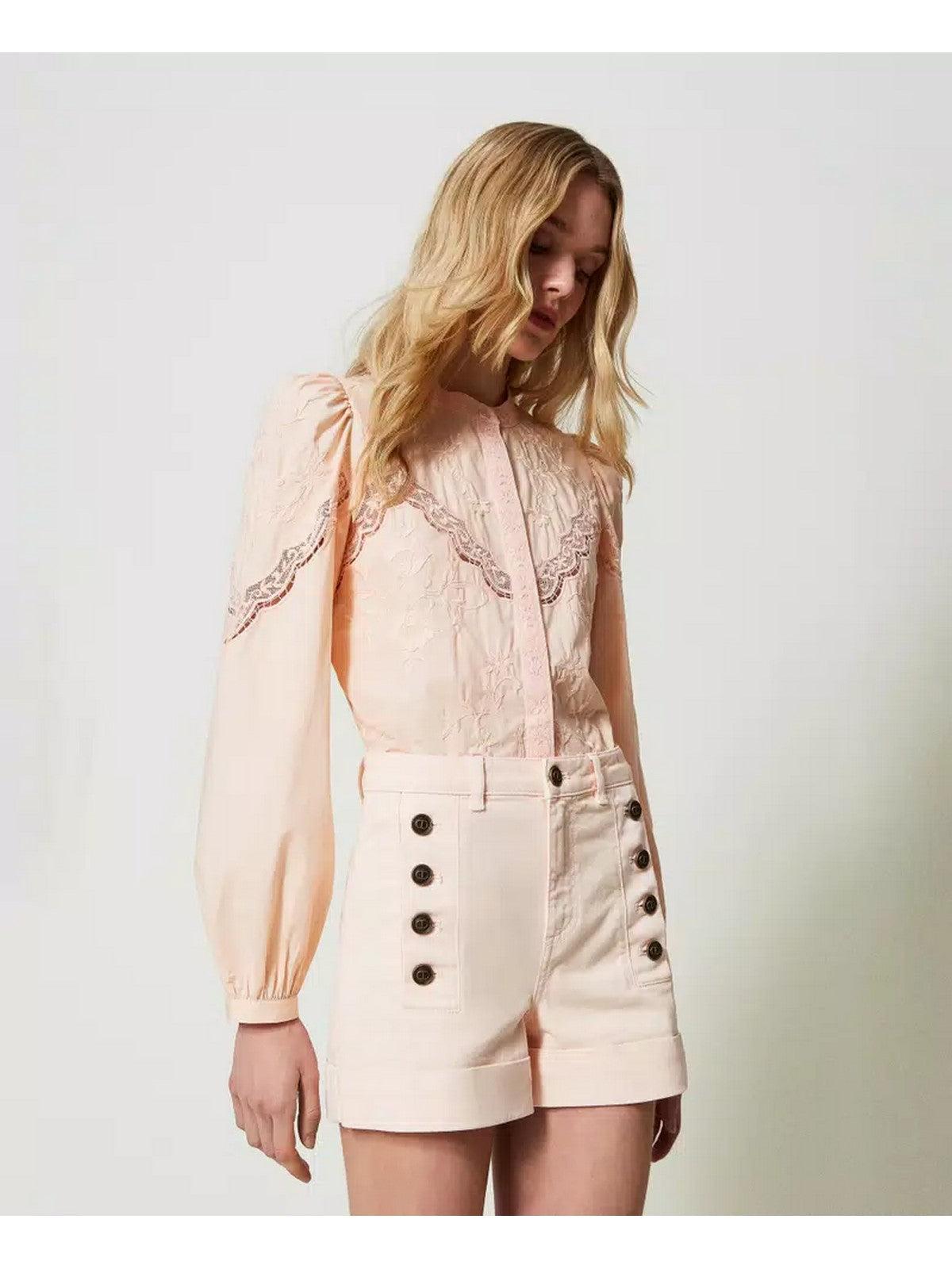 Shorts TWINSET in drill di cotone stretch tinto in capo. Tasche a filetto sui lati con bottoni marinière in metallo con logo. Chiusura con zip e bottone, risvolto al fondo.