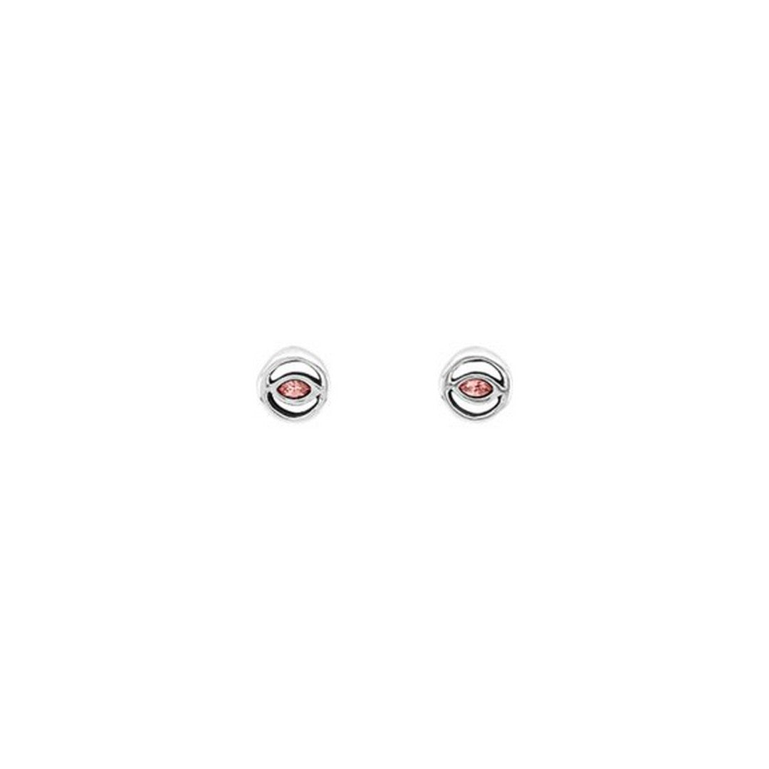 Orecchini a lobo della collezione UNO de 50 Pop Eye da donna. Colore: argento e rosa. Gli orecchini sono in lega metallica rivestita in argento 15 micron, con contorno circolare e un un ovale centrale con incastonati due cristalli Swarovski rosa, la chiusura è a perno. Made in Spagna, articolo realizzato totalmente artigianalmente.
