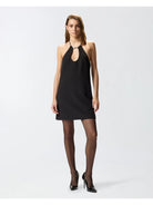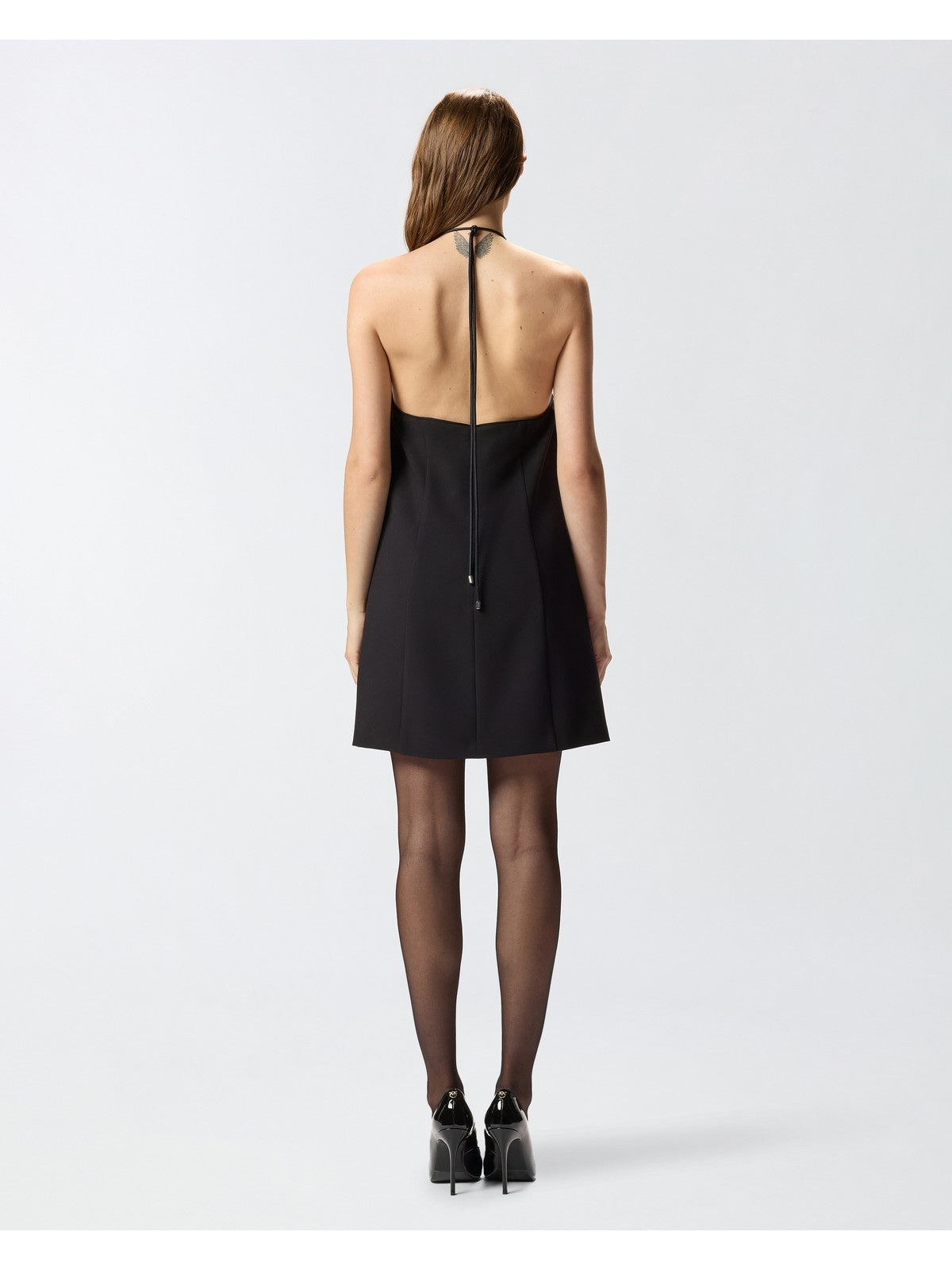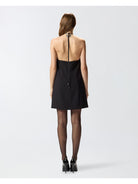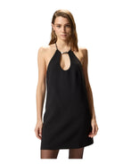 Abito corto dalla linea svasata con scollo a goccia, zip sul retro e tasche invisibili. Un tocco di sensualità è dato dalla schiena scoperta accarezzata dal laccio legato al collo che cade libero regalando movimento. Il tessuto in viscosa tecnica riesce a unire morbidezza e fluidità creando una texture sofisticata che offre comfort e vestibilità ottimali, senza perdere l'aspetto strutturato del design. Le linee pulite e moderne del design sono arricchite da elementi distintivi, come i dettagli gioiello di perle e metallo sul choker. Accendi le tue occasioni speciali e serate eleganti con questo abito da sera pensato per dare un valore unico alla tua femminilità, soprattutto se abbinato a un paio di scarpe décolleté dal tacco alto.