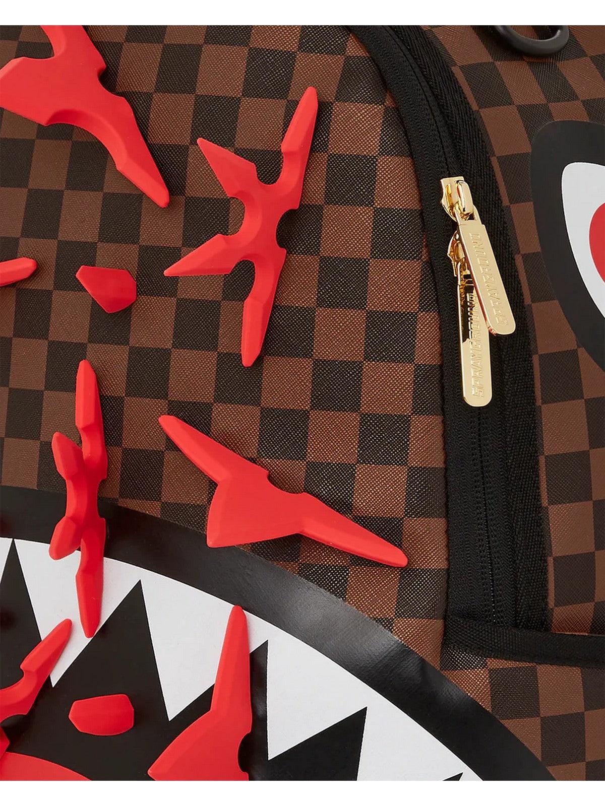 Zaino SPRAYGROUND in pelle vegana dura, stampa quadri marroni e neri, Impreziosito da stelle Ninja in gomma 3D. Bagde "Sprayground Authentic" in metallo. Tasca piccola frontale , tasche laterali e tasca sotto il manico e scomparto principale con chiusura zip. Imbottitura posteriore ergonomica in rete con cinghie regolabili per taglie personalizzate. Manicotto posteriore scorrevole si collega al bagaglio a mano. Interno con scomparto separato per laptop e scomparto separato per occhiali da sole in velour. Tasca organizer in rete.